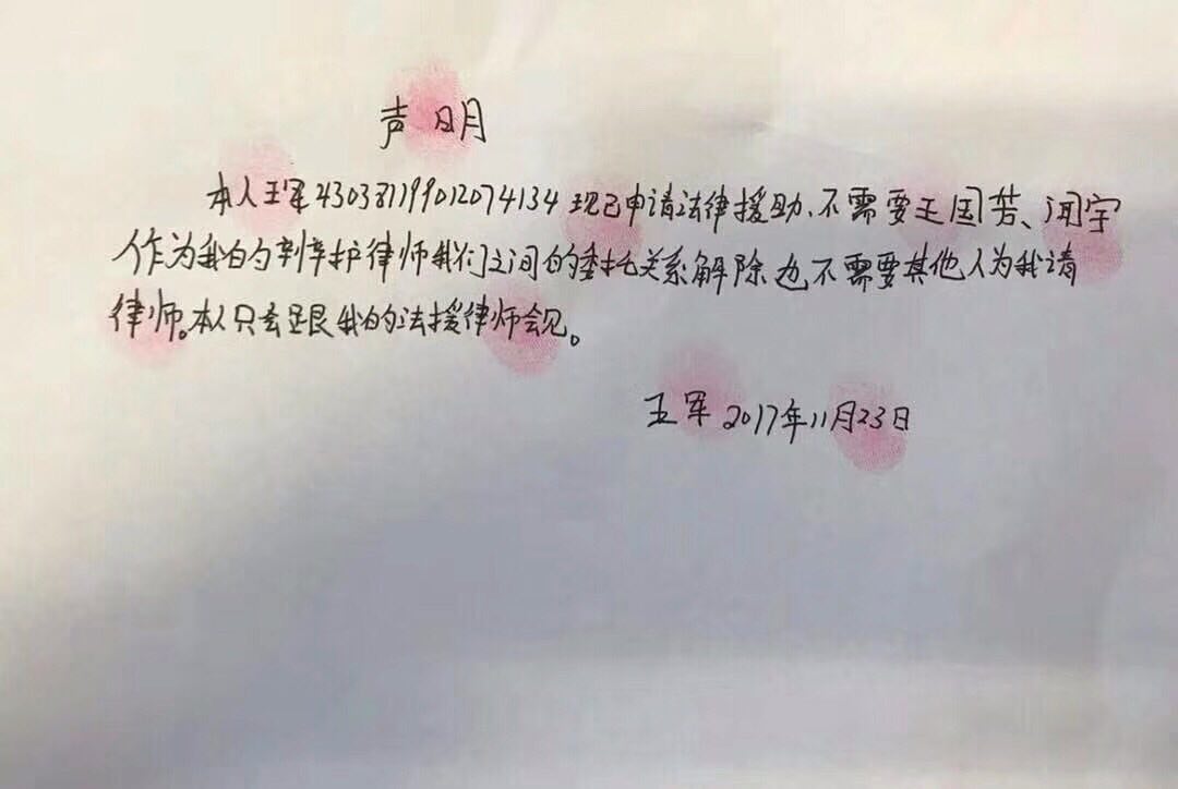 此外,本网人权观察员今天得到消息,另一位被捕人士王军也以同样方式要求解除家属委托的代理律师,王军在书面声明中说:“他已申请法律援助律师,要求解除与王国芳、闻宇两位律师的委托关系,不需要任何人帮他请律师,只会跟法律援助律师会见”。