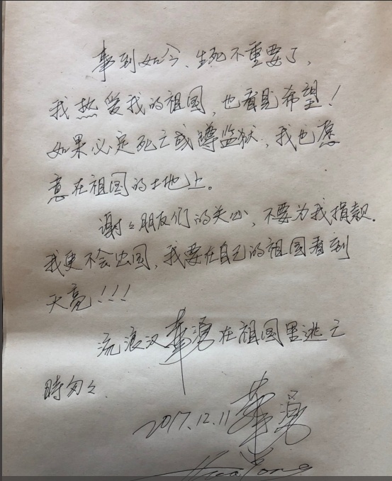 今天华涌先生发出消息称:“事到如今,生死已经不重要了,我热爱我的祖国,也看见希望!如果必定死亡或蹲监狱,我也愿意在祖国的土地上。谢谢朋友们的关心,不要为我捐款,我更不会出国,我要在自己的祖国看到天亮!——流浪汉华涌在祖国里逃亡时匆匆。2017.12.11”