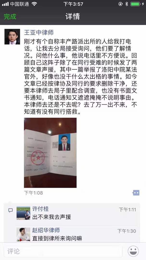 蹊跷的是,今天下午河南国银律师事务所的王亚中律师也发出消息称:“刚才有个自称丰产路派出所的人给我打电话,让我去分局接受询问,他们要了解情况。问他什么事,他说电话里不方便说。回顾自己这阵子除了在同行受难的时候发了两篇文章声援,其中一篇举报了洛阳中院某法官外,好像也没干什么太出格的事情。如今文章已经按律协及同行的要求删除干净,还要本律师去局子里配合调查,也没有书面文书通知,电话通知又遮遮掩掩不说明事由。本律师去还是不去呢?去了万一出不来,不知道有没有同行搭救。”