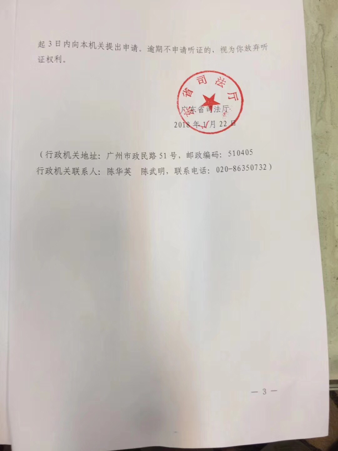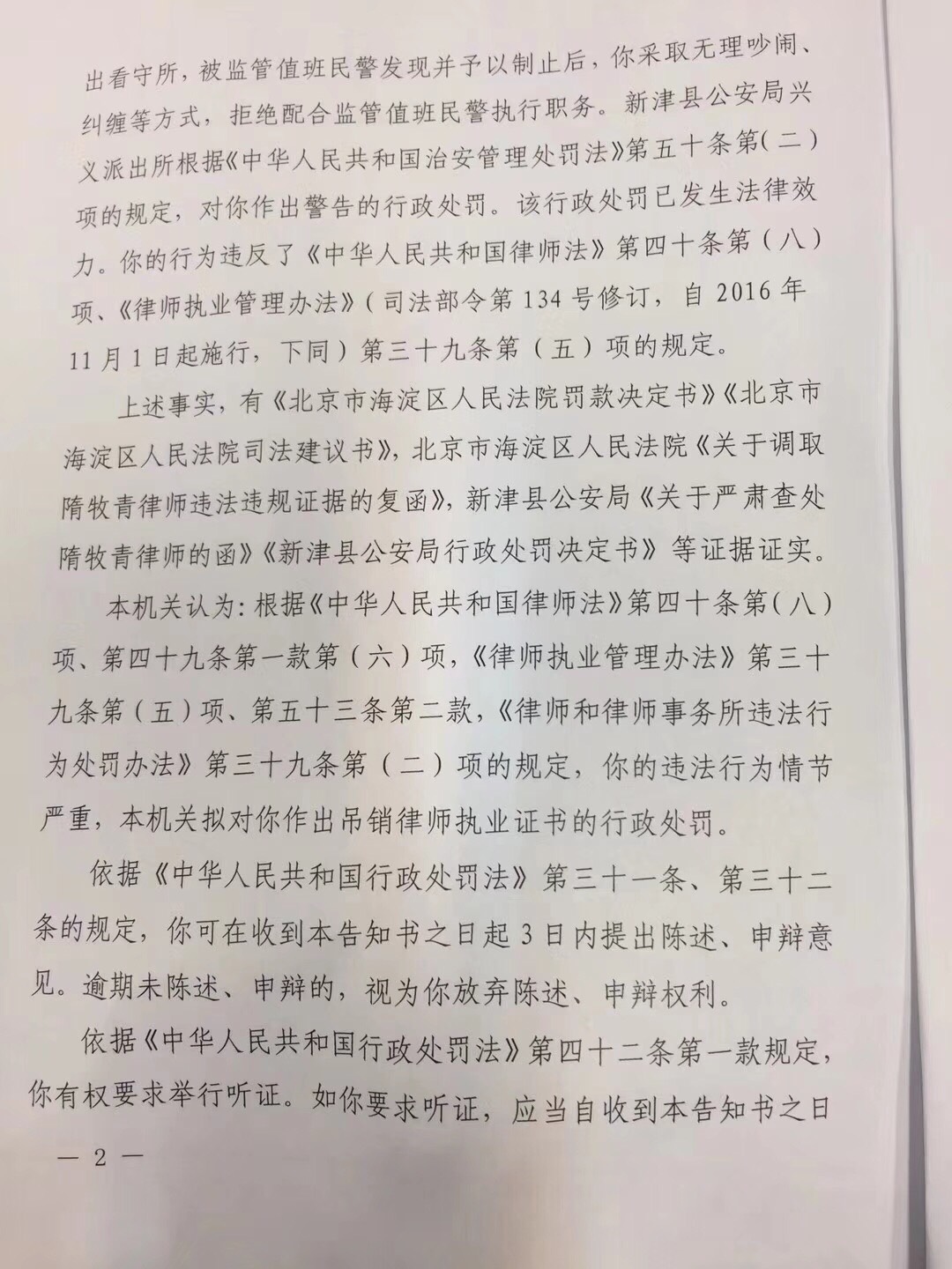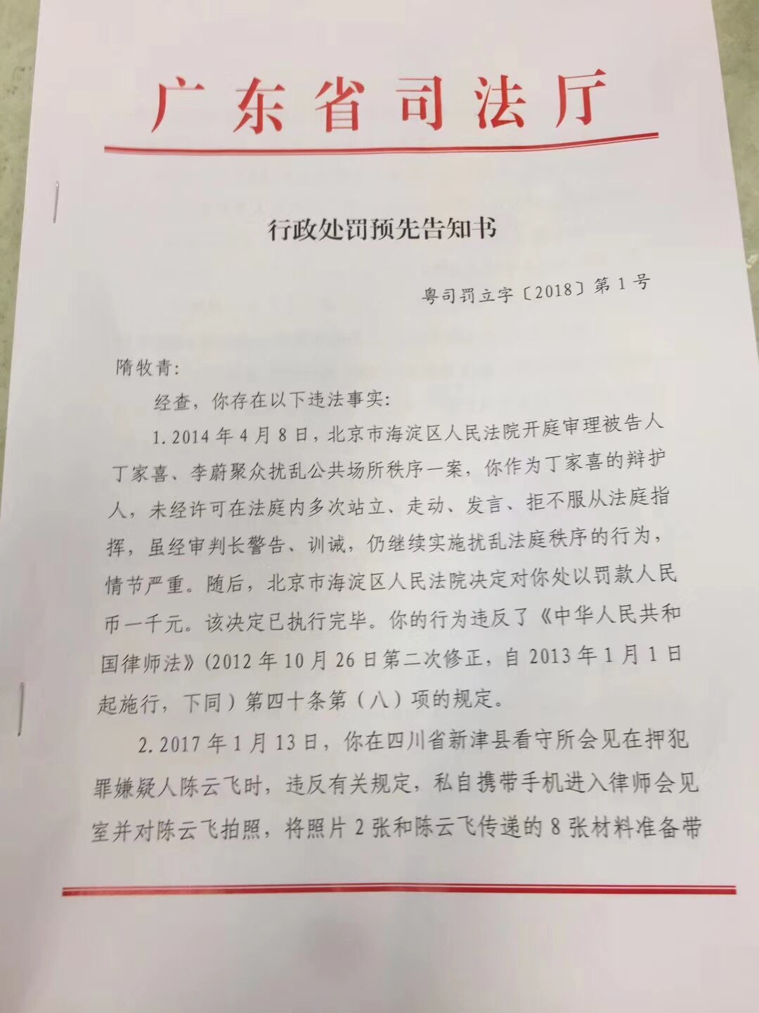 从《行政处罚告知书》中见到,广东省司法厅列举了隋牧青律师近几年在为“敏感”案件当事人担任辩护人的过程中所谓的数次违规、违法行为。譬如2014年4月8日北京海淀法院审理丁家喜、李蔚的“聚众扰乱公共场所秩序”一案中违规表现,以及2017年1月13日于四川新津县看守所会见陈云飞时手机拍照的违规行为等等。故按照《律师法》等法律规定,拟对隋牧青律师作出“吊销律师执业证书”的行政处罚。《告知书》称,当事人可以在三日内向广东省司法厅提出陈述、申辩意见,逾期未陈述、申辩的将视为放弃权利。此外,《告知书》还提到当事人可以有权要求举行听证,时间亦为三日内,逾期同样视为放弃听证权利。