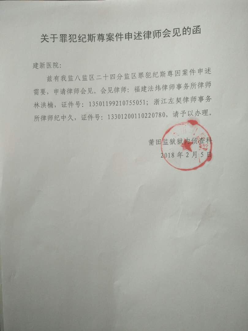 据悉,2月5日上午,福建纪中久和林洪楠律师急急忙忙赶往莆田监狱办理了会见纪斯尊的手续,然后马不停蹄的折返福州,在当天午后赶到福建省建新医院(监狱医院),终于见到了奄奄一息的纪斯尊。