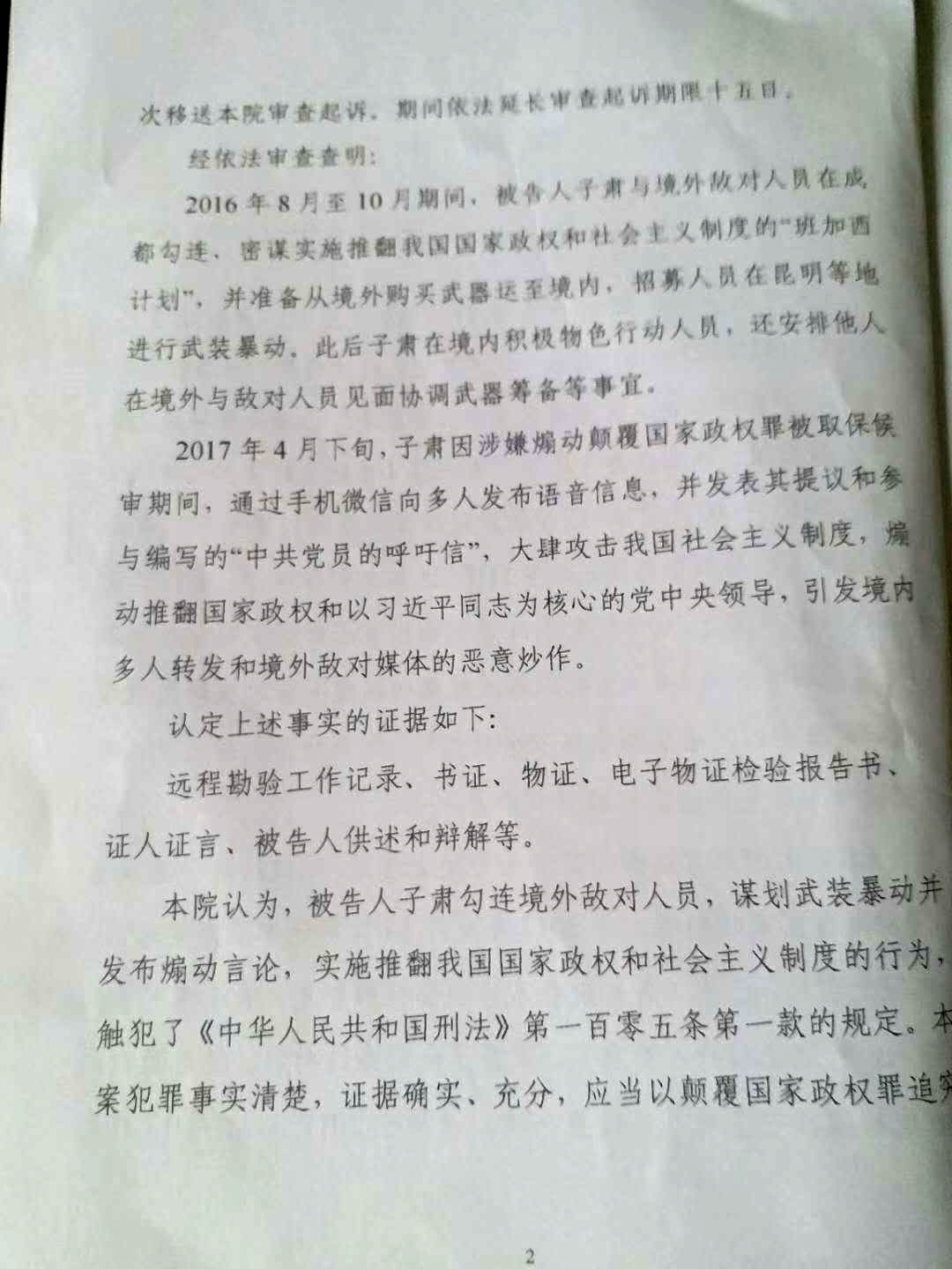 2017年4月下旬,子肃因涉嫌煽动颠覆国家政权被取保候审期间,通过手机微信向多人发布语音信息,并发表其提议和参与编写的“中共党员的呼吁信”,大肆攻击我国社会主义制度,煽动推翻国家政权和以习近平为核心的党中央领导,引发境内多人转发和境外敌对媒体的恶意炒作……