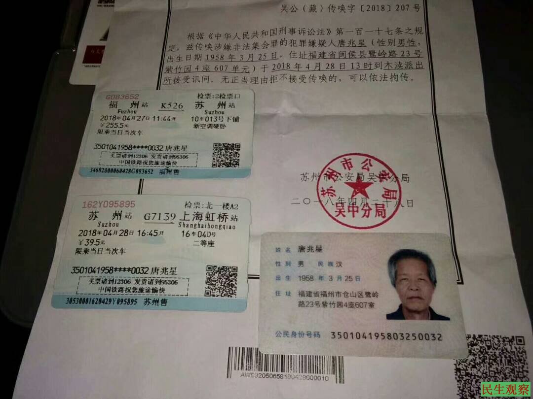 福建维权人士唐兆星介绍说,自己于昨天2018年4月28日早晨只身从福州抵达苏州。上午约10点唐兆星买了一束鲜花前往灵岩山准备到林昭墓前祭奠英灵,没想到刚到山脚,就被守候的苏州公安局吴中分局木渎派出所以莫须有的涉嫌“非法集会”刑事传唤抓走。后苏州市公安局吴中分局在昨天下午只得购买了一张从苏州到达上海的火车票,强行将唐兆星礼送离境了事。据悉,福州唐兆星现已在上海,他表示不服苏州警方滥用职权侵犯他人权的做法,将前往北京公安部控告反映。