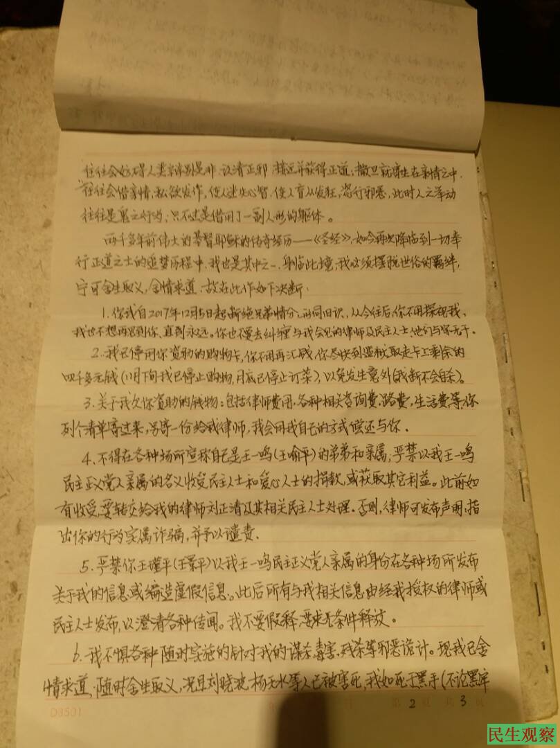 说明:2017年12月19日会见王喻平后,是否要在关心王喻平的亲友群里公开。我是根据法理学上的价值比例原则经过再三考虑的——因为此信涉及其私事,公布会对其弟王井平有一定负面影响。但此信的更大价值原则是——涉及到王喻平的生命安全问题,故大义不拘小节,在亲友群里公布!仅此而已,绝无在境外媒体或网站公开。2018年4月17日晚我与其弟王井平见面时向他作了解释,王井平表示理解,并无责怪我之意!