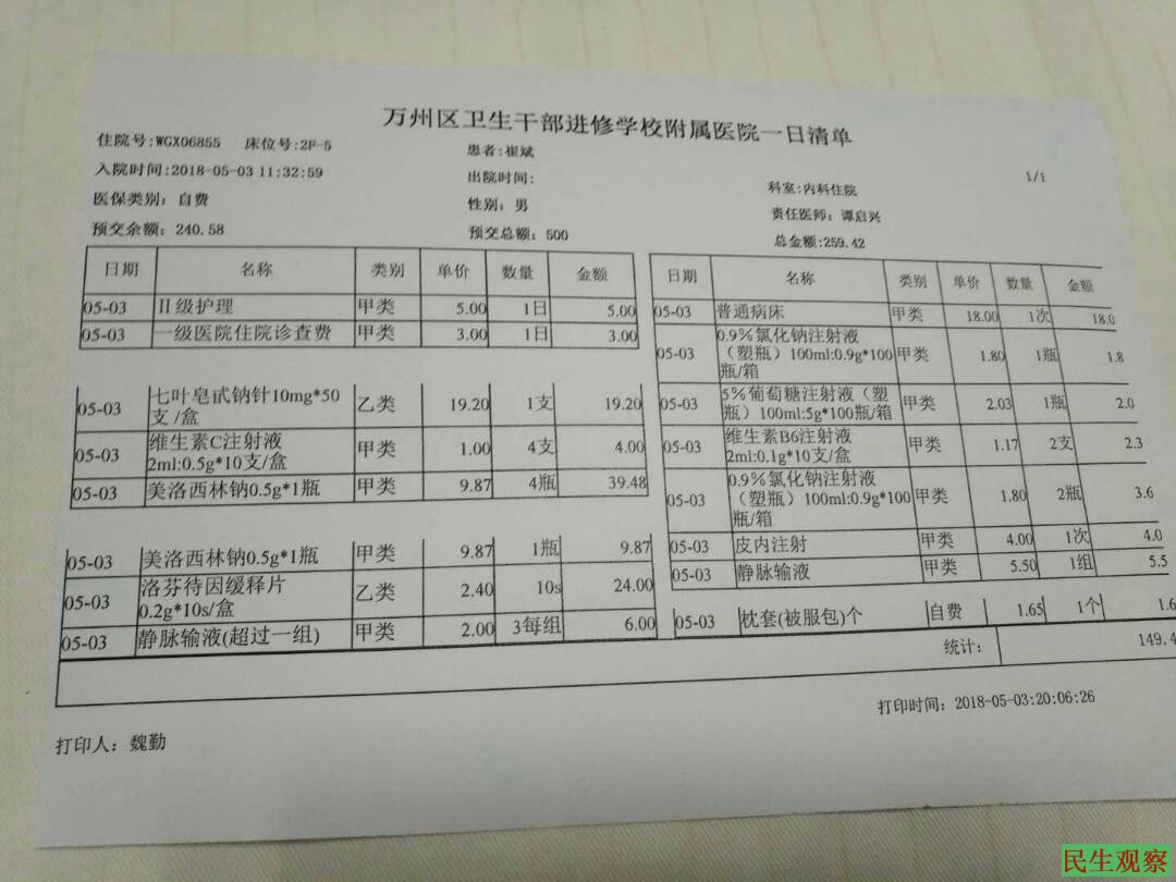 从5月1日开始头疼得很历害,他已经坚持不住了,头痛头晕想吐,吃不下一点东西,夜晚睡觉疼得睡不着。又坚持了一天,5月3日实在不行了,感到神志不清了。他就到离家很近的社区医院卫干校检查头部,医生说还要检查脖子才行,一检查脖子,脖椎第4、5、6根被打伤了,医生叫他住院观察。他心想不能再拖了,遂掏出身上全部现金只有500元交了住院费。