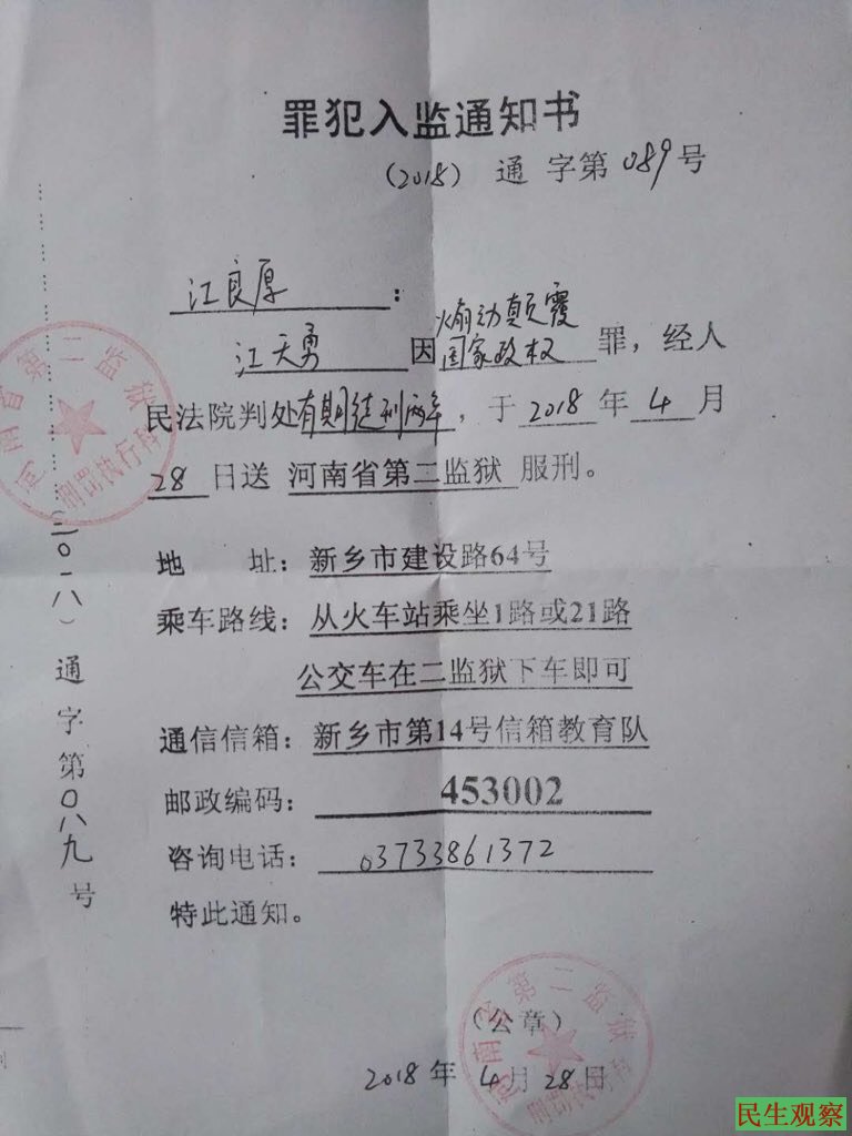 据悉,江天勇律师的父亲是在今日中午收到河南第二监狱寄来的《入监通知书》,通知书显示,江天勇律师早在4月28日已经被转送至该监狱。过年后,江天勇的妹妹曾多次向长沙第一看守所要求探视,但一直遭到各种理由的拒绝,在强烈抗议之下,看守所曾答应准许家属在5月4日进行探视,但江妹在4月28日接到所方电话,称江天勇已被转至河南某监狱,当时未透露其他详情。江天勇妻子金变玲表示,江天勇当前服刑的河南第二监狱位于河南新乡市,与江天勇老家河南信阳有一定的距离,搞不懂当局的安排有何含义,但愿丈夫在新乡的监狱不会受到虐待,能够活着回家。(图一、二)