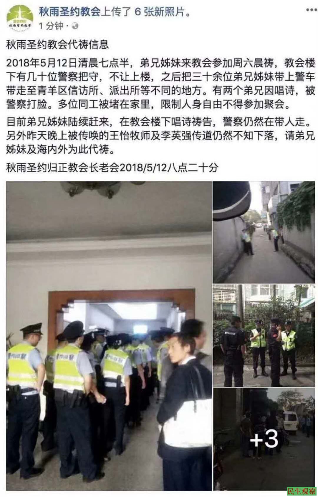 【民生观察2018年5月12日消息】本网获悉,今天是5.12汶川大地震十周年紀念日,成都秋雨圣约教会欲举行祷告聚会,以此来纪念在地震中丧生的骨肉同胞,不料却遭到成都警方的骚扰和阻止,目前大约有一百多人被抓走。