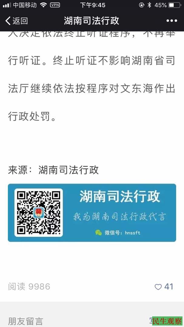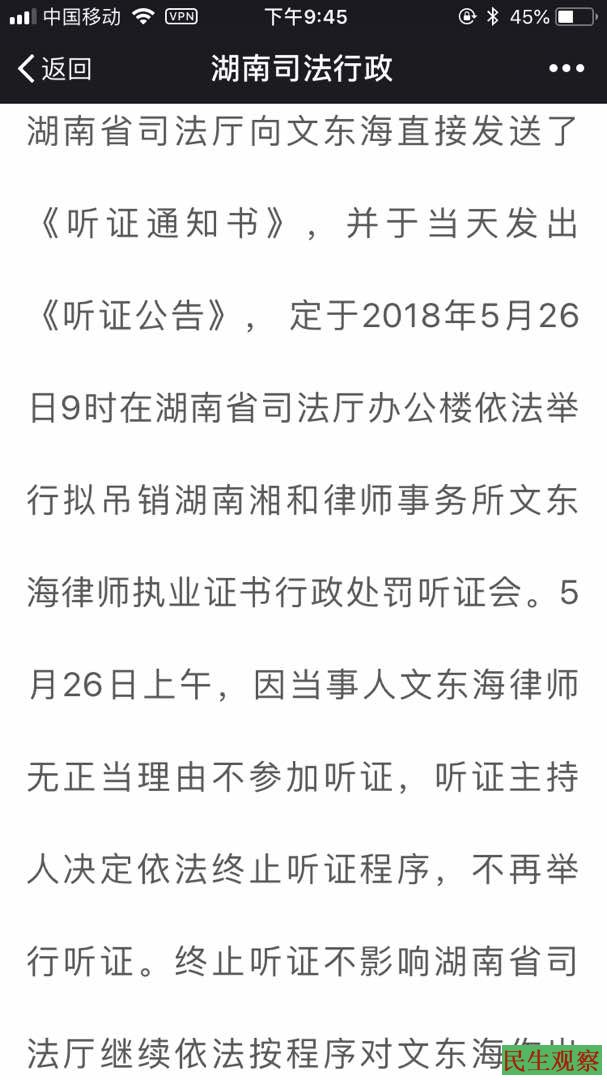 【民生观察2018年5月26日消息】定于2018年5月26日9时在湖南省司法厅办公楼依法举行拟吊销湖南湘和律师事务所文东海律师执业证书行政处罚听证会。 程海,李贵生律师和文东海一起参加他拟吊律师证听证会,在湖南省司法厅西门,有一黑衣人故意干涉和一个记者模样的人谈话,并拉扯文东海,使劲往远处拉。程海律师随即110报警。约十几分钟警察来处理。听证主持人要求文东海律师尽快进去听证,律师们说现场人身伤害的事优先,得赶快把打人的违法嫌疑人抓了,如果跑了,如湖南司法厅愿意负责律师们就优先参加听证。从里面回到西门外,嫌疑人已经跑了。后警察和司法厅人协商,律师现到韭菜园派出所做报案笔录。而湖南省司法厅却立即做出如下的决定“无正当理由不参加听证,听证主持人决定依法终止听证程序,不再举行听证。终止听证不影响湖南省司法厅继续依法按程序对文东海作出行政处罚。”
