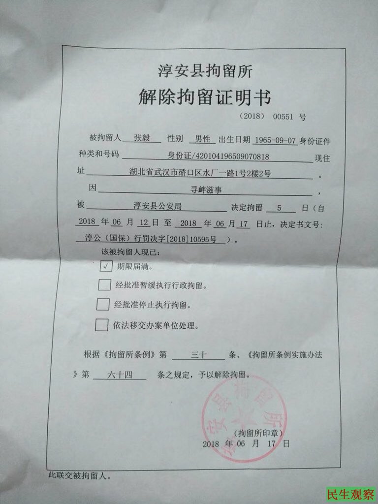 【民生观察2018年6月20日消息】本网获悉,本月初在浙江淳安因发布移花接木的“刘晓波衣冠冢”照片而被淳安警方以“寻衅滋事罪”刑事拘留的武汉维权公民张毅由警方撤销刑事指控后改为拘留十二天的行政处罚,于6月17日期限届满释放,已在6月18日回到武汉家中。