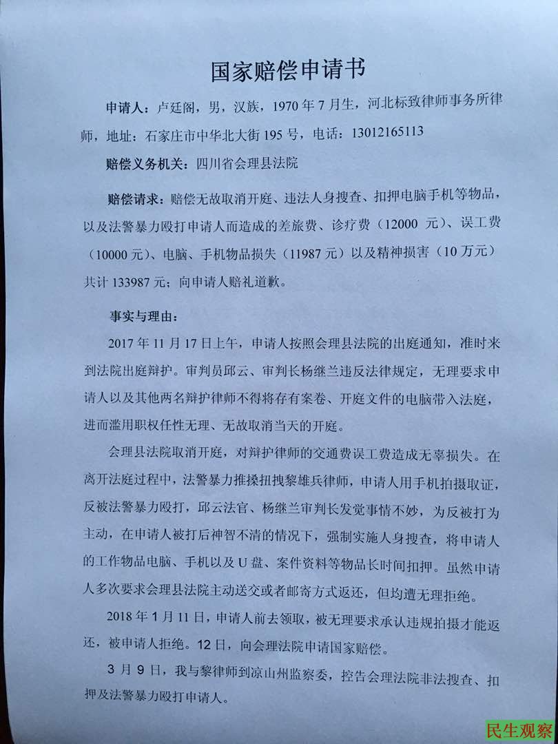 另外,卢律师透露,根据上次会理县法院驳回其提出的国家赔偿申请,此次将两份决定书一起附上,再次向凉山州中级法院申请国家赔偿,维权行动计划一步一步走下去。