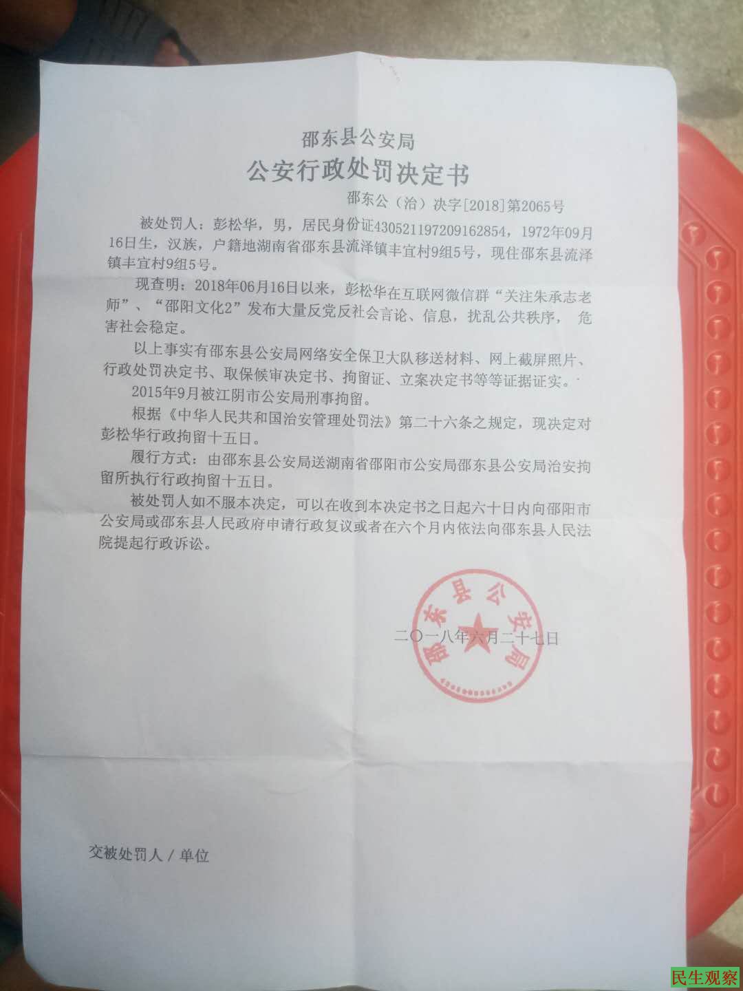 【民生观察2018年7月12日消息】本网获悉,湖南知名维权人士、《讨习檄文》作者彭佩玉(本名彭松华)今日(7月12日)获释。彭佩玉从拘留所带出的《公安行政处罚决定书》中显示,因其在互联网“发布大量反党反社会言论、信息,扰乱公共秩序,危害社会稳定”而被邵阳邵东当局行政处罚拘留15日。