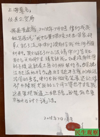 今天下午,董建彪向上海和湖南警方发出公开信,指出警方执法犯法。董建彪称,上海警方、湖南攸县公安,在未出示任何法律手续的情况下就传讯自己,并且还不依法告知其女儿的下落。如果警方不依法出具法律手续就抓走并关押自己的女儿董瑶琼,那么这就是土匪绑架的行为。在警方做完笔录后,他们还让煤矿开除了董建彪,并且拖欠其三个月工资拒不支付,这是要把他往绝路上逼,他誓言要为女儿讨说法。