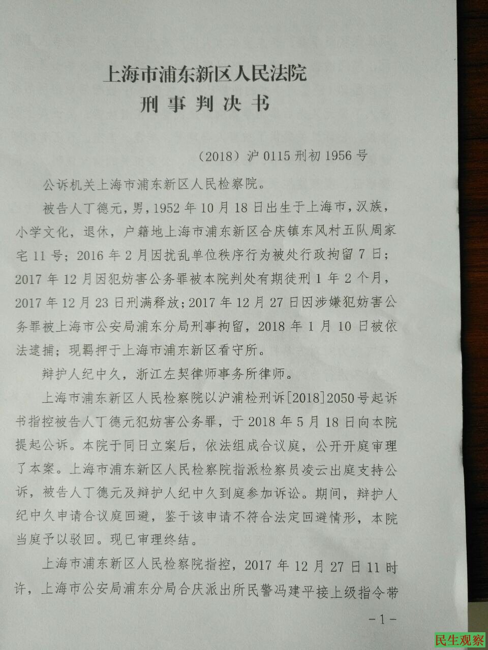 【民生观察2018年8月22日消息】近日,上海维权访民丁德元被控“妨害公务罪”一案在上海市浦东新区看守所宣判,丁德元获刑两年零六个月,刑期自2017年12月27日起至2020年6月26日止。该案于2018年7月25日在浦东新区法院第一庭开庭审理。丁德元此次因维权获刑已是两年内的第二次,上次(2016年10月24日)被浦东新区公安分局控以同样罪名获刑一年零两个月,2017年12月23日刑满释放,12月27日,丁德元再次被浦东分局以“妨害公务罪”抓捕,半个月后批准执行逮捕。