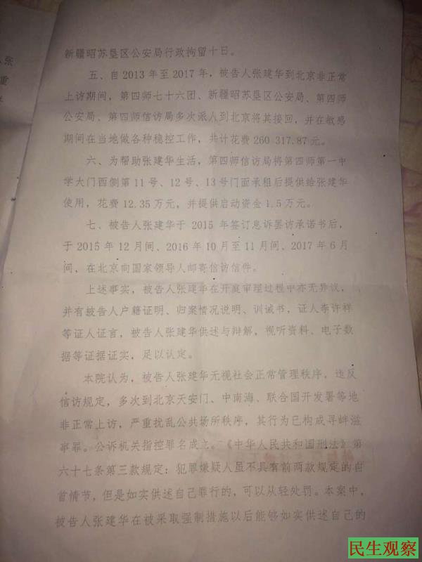 张建华因为承包土地买了假农药后造成颗粒无收,通过打官司而走上维权道路,在北京认识了江西的访民朱玉芳,还有新疆的访民李建筑,张建华在北京维权中与李建筑,朱玉芳等朋友一起在北京发放访民文化衫,文化衫前面印有《没有腐败就没有访民》,后面印有《支持习,李,王反腐》字样,张建华,李建筑,朱玉芳他们三人经常在北京信访局及北京南站等地发放访民文化衫,他们在北京南站还认识了其他重多访民,她们三个人就随其他访民一起去上访,他们经常在北京亮马河联合国住中国大使馆附近发放访民文化衫,北京亮马河附近各国大使馆都设在哪里,亮马河附近每天都有很多访民在使馆区上访,因此她们三人被亮马河附近的警察收缴了访民文化衫,并且将她们三人都刑事拘留,因为上访张建华多次被非法拘留,李建筑已经失联好几年了目前下落不明,朱玉芳因此维权上访被江西当地判刑三年多,朱玉芳目前已经刑满出狱。