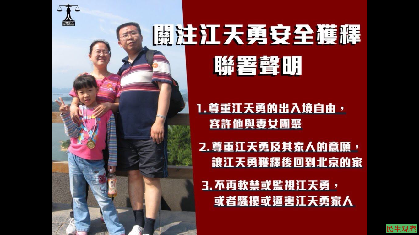 一直关注江天勇的群体作出《联署声明》,提出三点基本要求:1.尊重江天勇的出入境自由,容许他与妻女团聚;2.尊重江天勇及其家人的意愿,让江天勇获释后回到北京的家;3.不再软禁或监视江天勇,或者骚扰或逼害江天勇家人。