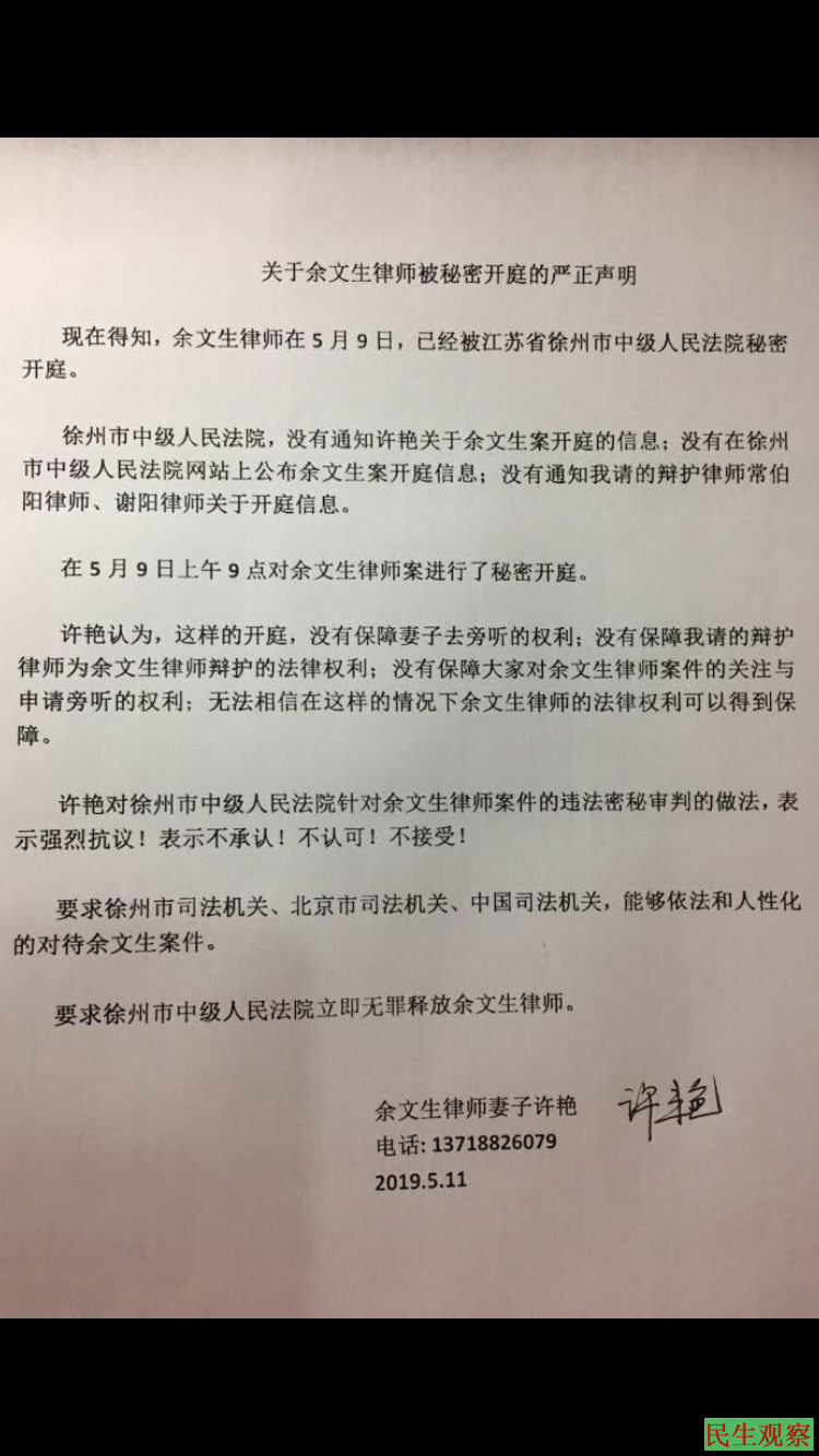 【民生观察2019年5月11日消息】今日(11日周六)中午,余文生律师的妻子许艳女士发出一份声明,公布余文生被控“煽动颠覆国家政权罪”一案(或)已于5月9日(周四)在徐州市中级法院秘密开审,许艳女士对此提出强烈抗议,表示不承认、不认可、不接受。