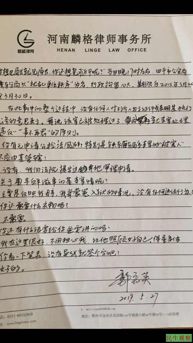 2019年5月27日,上午8点姬来松律师到看守所会见了被判刑的郭宏英女士,郭宏英女士向律师讲述了她家的冤案情况,她认为当局有意设局构陷涉嫌寻衅滋罪,这一切都是当局为了打击报复她们一家人而特定的”家庭套餐”一家三口入狱。