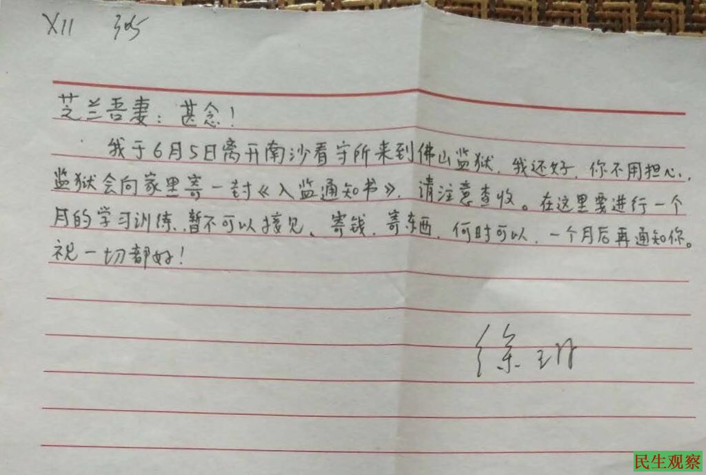 【民生观察2019年6月29日消息】本网获悉,被控“寻衅滋事罪”获刑三年的广州建筑师、民运歌曲创作人徐已于月初被转到佛山监狱服刑,家属已收到监狱方寄来的《入监通知书》,同时还有徐琳写给妻子的家书,表示自己很好。