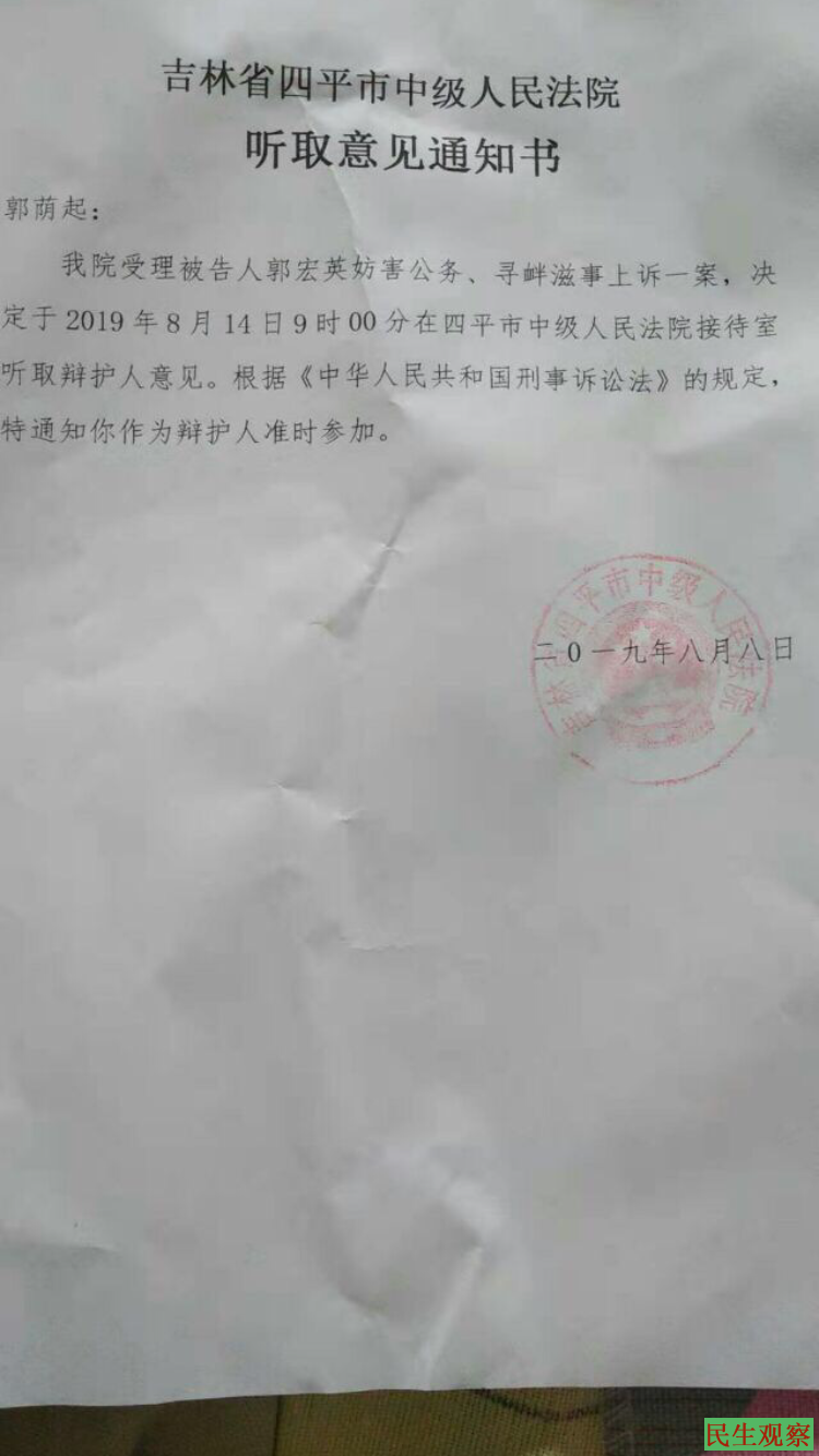 郭宏英上诉二审向法院提交了由父亲参加二审辩护,法院已同意郭荫起参加辩护郭宏英妨碍公务,寻衅滋事一案,法院通知郭荫起八月十四号上午9点到吉林中级法院接待室听取辩护人的意见。