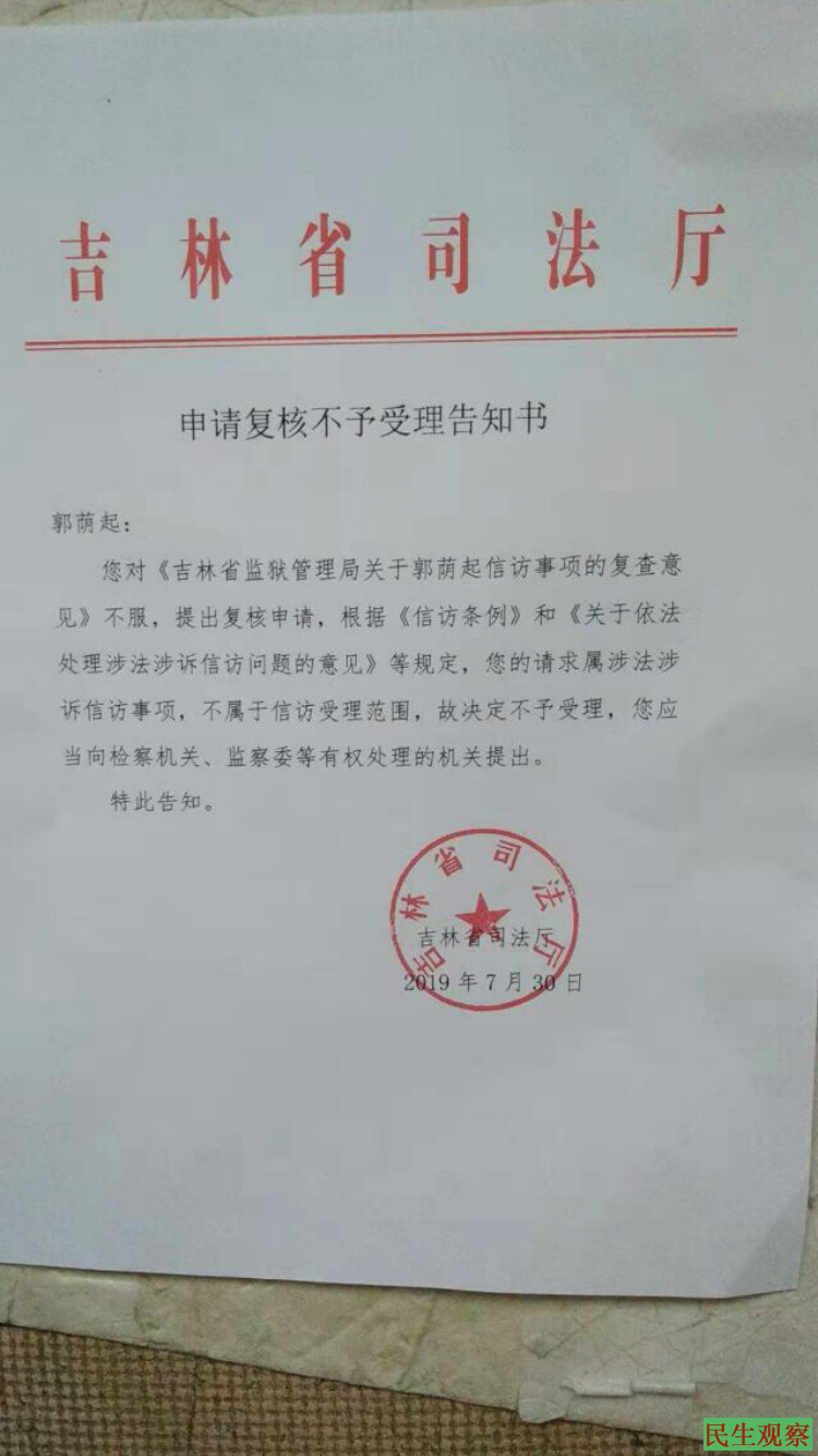 郭宏伟在监狱遭到殴打一事,郭荫起多次到吉林省高院反映情况,几个月不给答复,也不做任何处理还多次刁难,郭荫起在今天才收到吉林司法厅的回复意见答复,不予受理。