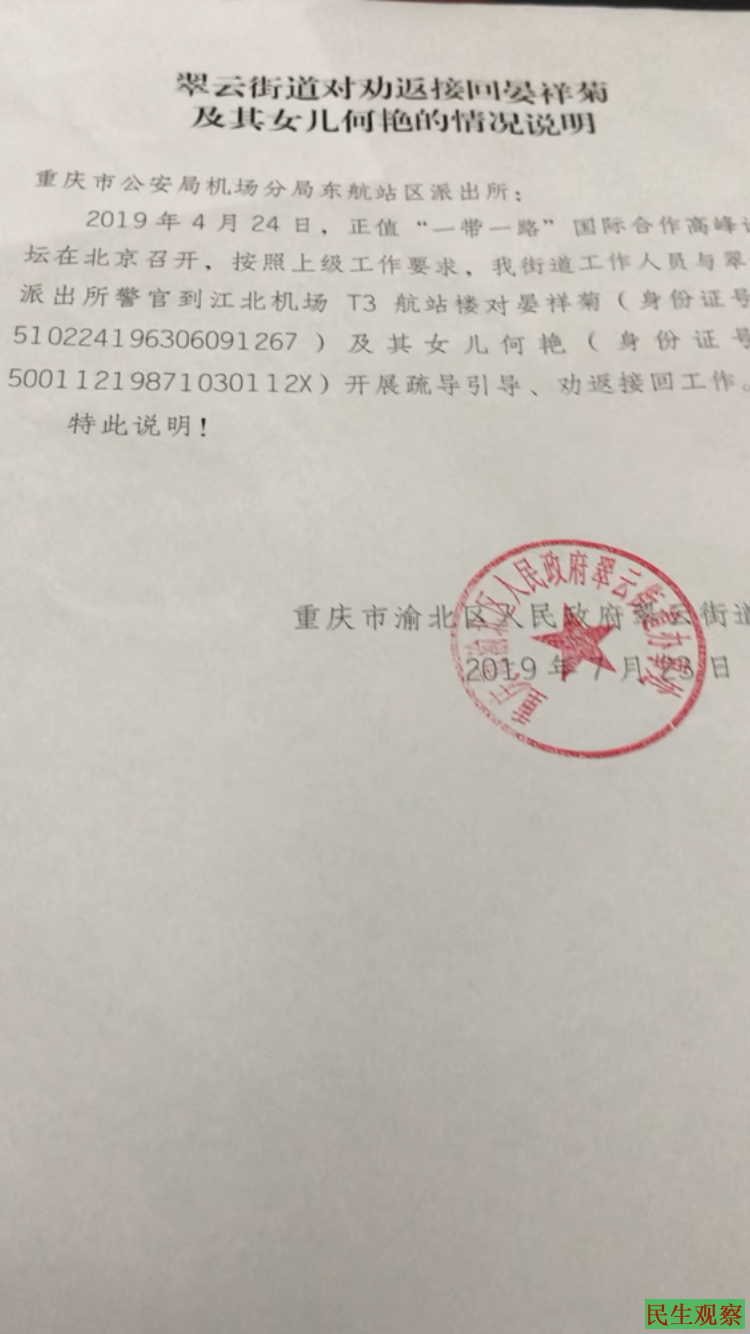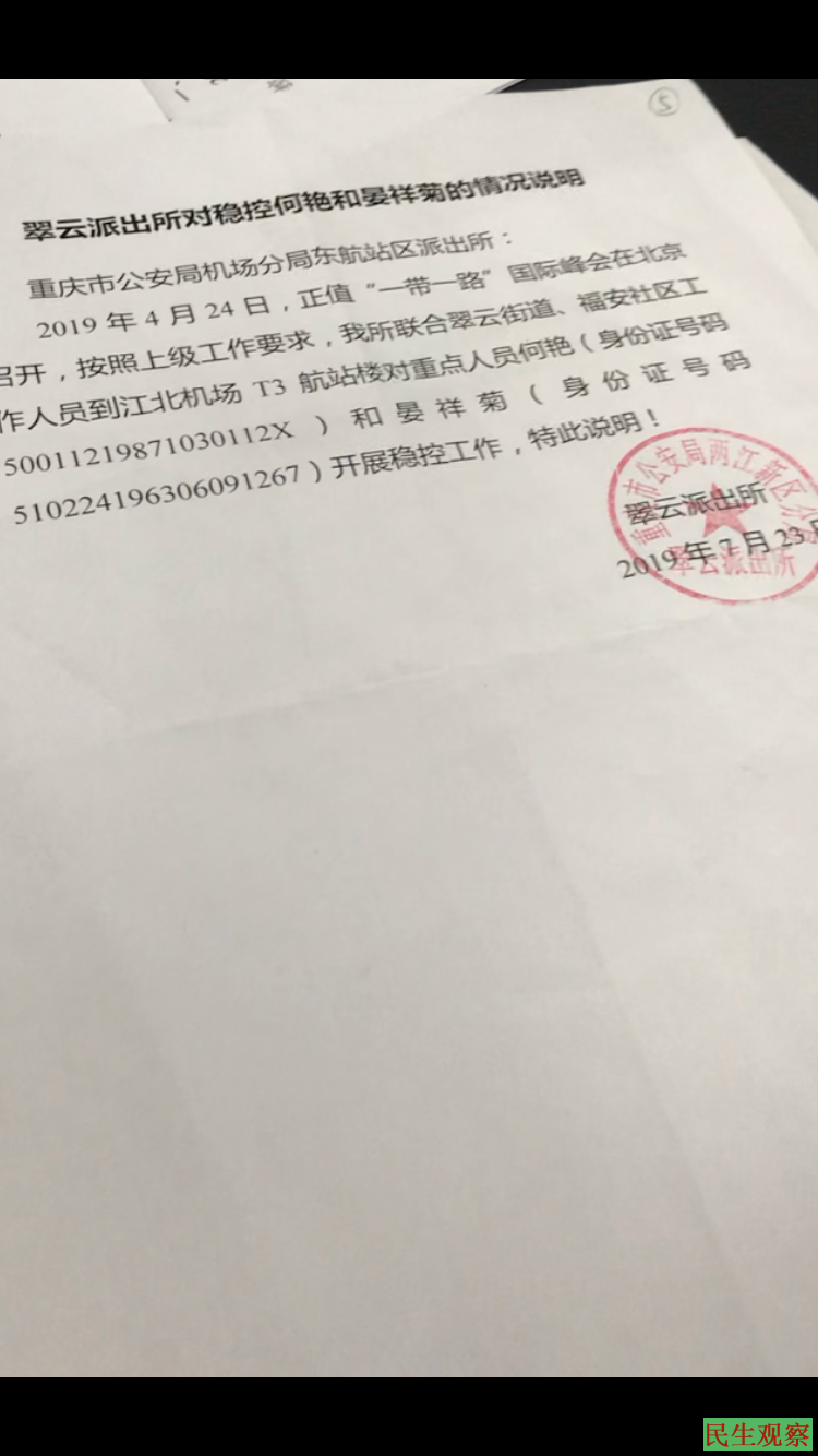 2019年8月9日,距离该案发生近四个月时间,相关机关单位公文流出,还原了她和母亲当日被绑架的真相,系重庆当局将其母女二人定为重点人员,流出的公文还载有重庆两江新区翠云街道办事处和重庆市公安局两江新区分局翠云派出所,系接上级工作要求,对母女二人实施上述行为的。