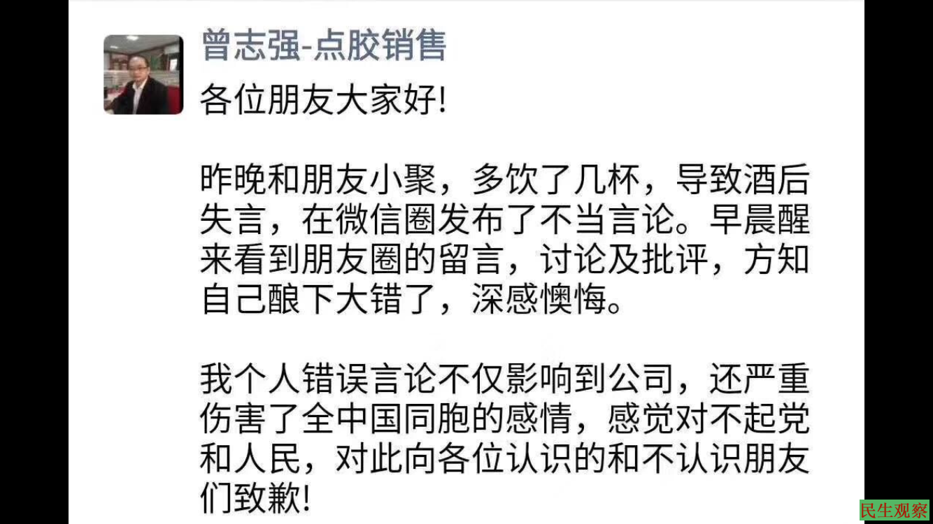 【民生观察2019年8月12日消息】本网获悉,东莞一公司员工日前因在酒后发表“大陆猪”言论遭公司作劝退处理,并要求公开认错及致歉。