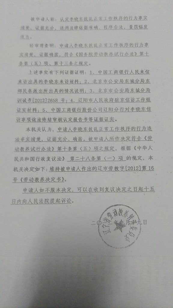 2012年7月4日,辽阳市工商银行与政府公安局相互勾结,共同作假,以打击报复维权访民,银行,政府,公安局联合制造冤假错案做出对李晓东劳教一年的非法处罚,2013年5月10号解除劳教,但是低保依旧不予恢复,最基本的生活权利都不给予,李晓东失去工作没有任何收入每个月靠仅有的一点点低保生活,低保被停止,生活极其艰难,在多次奔走投诉下才在2014年3月恢复了低保,从2012年4月停发到2014年3月期间23个月的低保一直不予补发,李晓东2012年7月被非法劳教,但是相关部门却在2012年4月就停止了低保,依照相关法律即使处罚期间不发低保也应该是在2012年7月以后停发,而不是在2012年4月份就提前停止,辽阳市民政局完全是违法操作,民政局到底是受谁指示这样违法操作?辽阳市黑社会受谁保护?银行行长背后强大的靠山保护伞是谁?李晓东所受到的构陷迫害该由谁来负责?