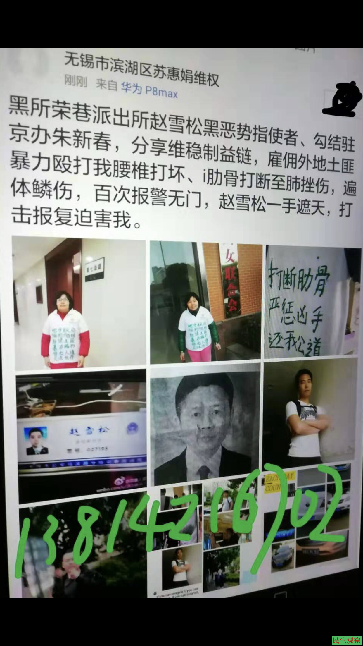苏惠娟说,“无锡有大批的上访人员被拘留,关押,进黑监牢,在北京市丰台区洋桥附近有个‘京华饭店’是无锡市的驻京办事处,里面还有无锡荣巷派出所人员。驻京办故意用数倍甚至数几十倍高于‘高铁’的费用支出雇佣黑车,指使黑车人员多次暴力殴打上访人员,同时又能捞取折扣外快,如此的驻京办接访人员,在危害政府信誉力,为政府抹黑。对此,我们上访人员深恶痛绝,2016年12月25号我被驻京办圈养的打手邓末根,此人住无锡滨湖区太湖镇东群村长旺路123号,绑架暴打至腰椎盘突出,过后我打了一百多个110报警电话,警察到场后不作为。有电话录音和病历为证,之后我又到无锡荣巷派出所报案,副所长赵雪松坚决不给我案件受理回执。”