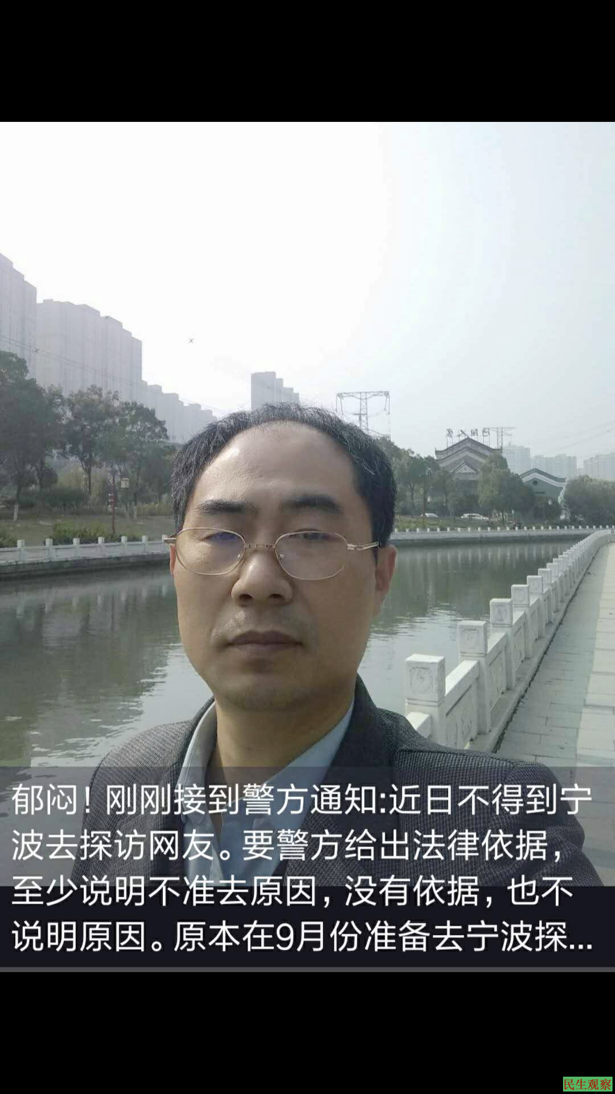 郁闷!刚刚接到警方通知,近日不得到宁波去探访网友。要警方给出法律依据,至少说明不准去原因,没有依据,也不说明原因。原本在9月份准备去宁波探访网友,却突然接到警方通知,10.1夺权纪念日期间不得到外地、武汉军运会期间不得到外地去,警方的通知虽没有给出法律依据,但我也理解维稳人员私人的难处,答应了呆在家里不外出,直至11月1日解禁。可是,如今已经是11月4日,我也多次告知警方近日将去宁波,警方并未反对。昨天,当我已经在预定火车票准备好了今天中午出发时,又突然接到现居住地警方的通知:不能去!——悲乎!我们的法治社会。悲乎!传说中的社会主义自由、民主、人权。