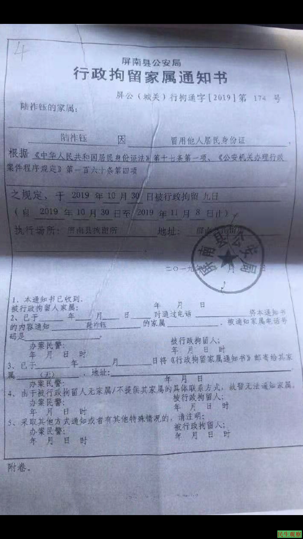 【民生观察2019年11月24日消息】本网获悉,福建省宁德市屏南县公民陆祚钰,去北京参加法院开庭应诉,被地方政府雇佣歹徒绑架殴打,带回当地后先行政拘留,拘留期满后又以涉嫌寻衅滋事罪刑事拘留。