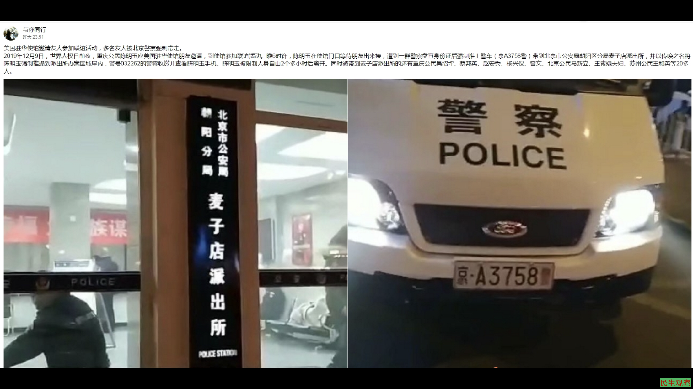【民生观察2019年12月10日消息】今天是世界人权日,因为受邀参加美国大使馆在京举办的“世界人权日联谊会”,二十多名中国参会者于12月9日晚赴约途中,在驻北京美国大使馆附近被北京市警察粗暴抓走。