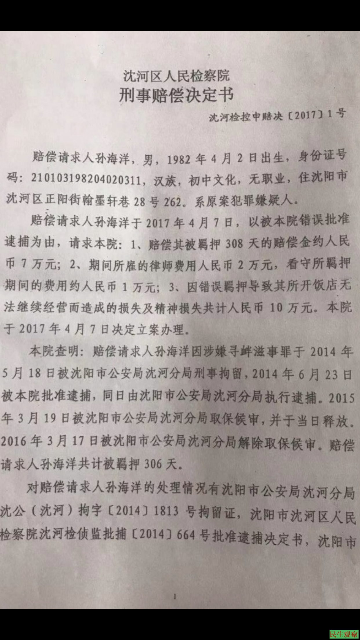 2015年3月19日,沈河区公安分局国保大队给孙海洋办理了取保候审。至此,孙海洋在沈阳市第一看守所里整整被关押长达308天。2017年5月,沈河区检察院给孙海洋平反昭雪,并给予了国家赔偿7万余元。