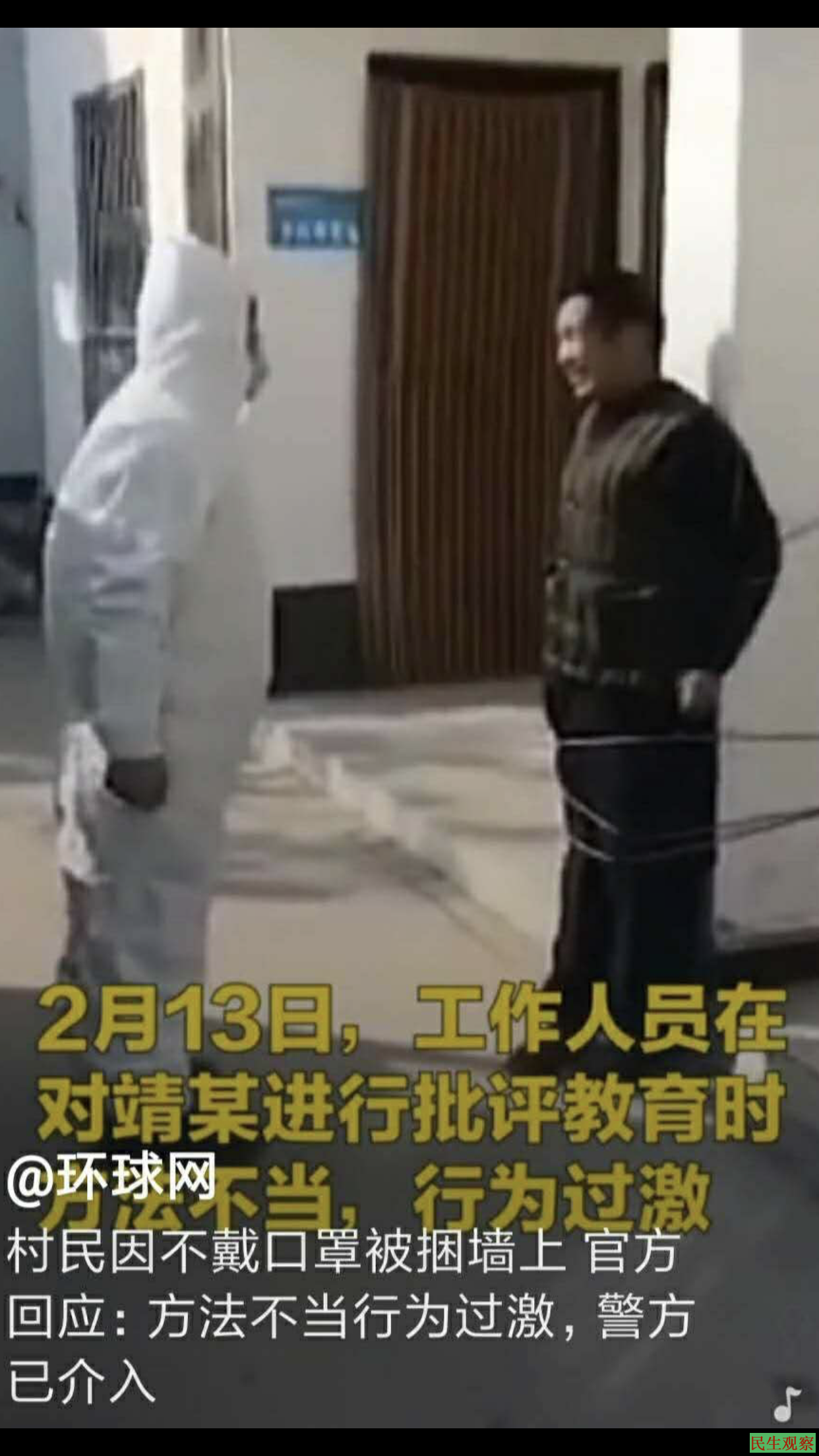 2月17日,网路上流传一段现场视频,视频中一名中老年男子在街上没有戴口罩,后被全身穿着防护衣的防疫人员施暴捆绑在柱子上,并咆哮的斥责说:“你为什么不带口罩?”遭捆绑男子回答“忘戴了”,防疫人员接着训斥道“你还想活吗?你不想活了,但老百姓还要活。”防疫人员态度非常粗暴。