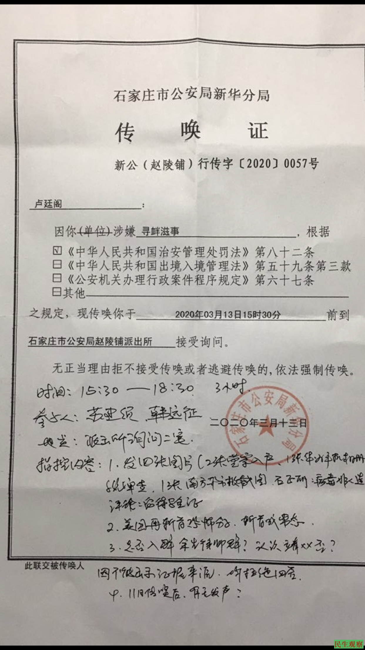 【民生观察2020年3月14日消息】本网获悉,河北石家庄人权律师卢廷阁再次因为网络言论遭到派出所传唤,系三日之内第二次,而元旦以来已有多次传唤记录。卢廷阁本人认为警方严重侵犯其个人的言论自由,并以频繁传唤的方式进行变相羁押。