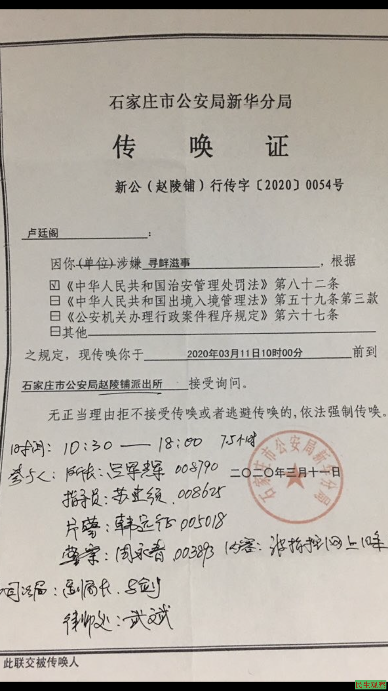 而两日前(3月11日)上午,警方派出四警到卢家敲门,声称传唤,卢廷阁以无传唤手续不配合并拒绝开门,在赵陵铺派出所指导员致电承诺有传唤证后,十点半到达派出所,至傍晚六点才获释放,历时七个半小时。