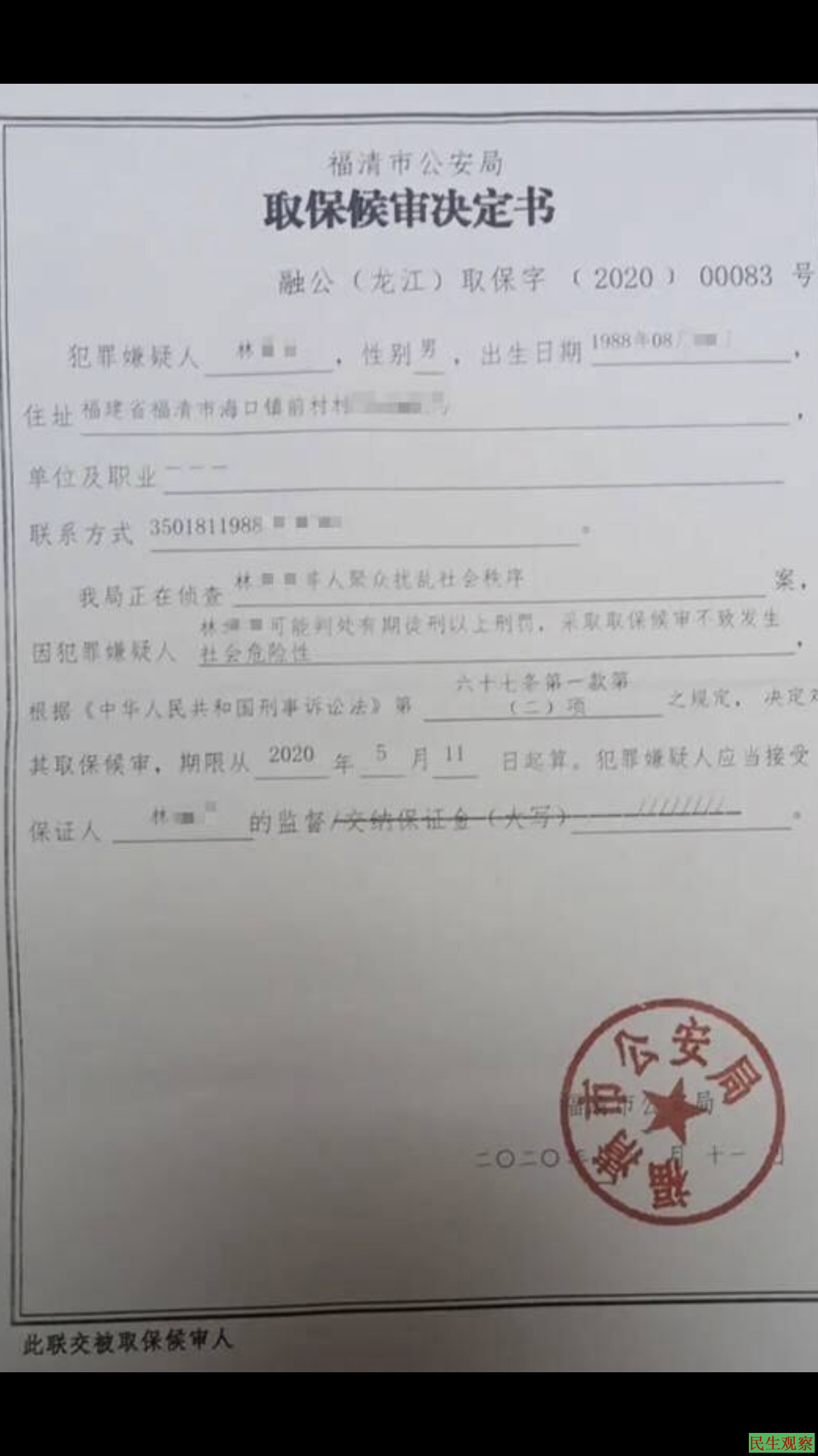 【民生观察2020年5月16日消息】本网获悉,福建福清市的林先生因一双儿女在市政工地溺水身亡,于2020年5月9日应约来到街道办与施工方商谈,商谈期间双方对责任争论不下,政府就叫来警察把林先生及其亲友带走刑拘。5月11日,林先生等3人在收到《取保候审决定书》后被放回,另有2人则被送往当地闽清县看守所羁押。