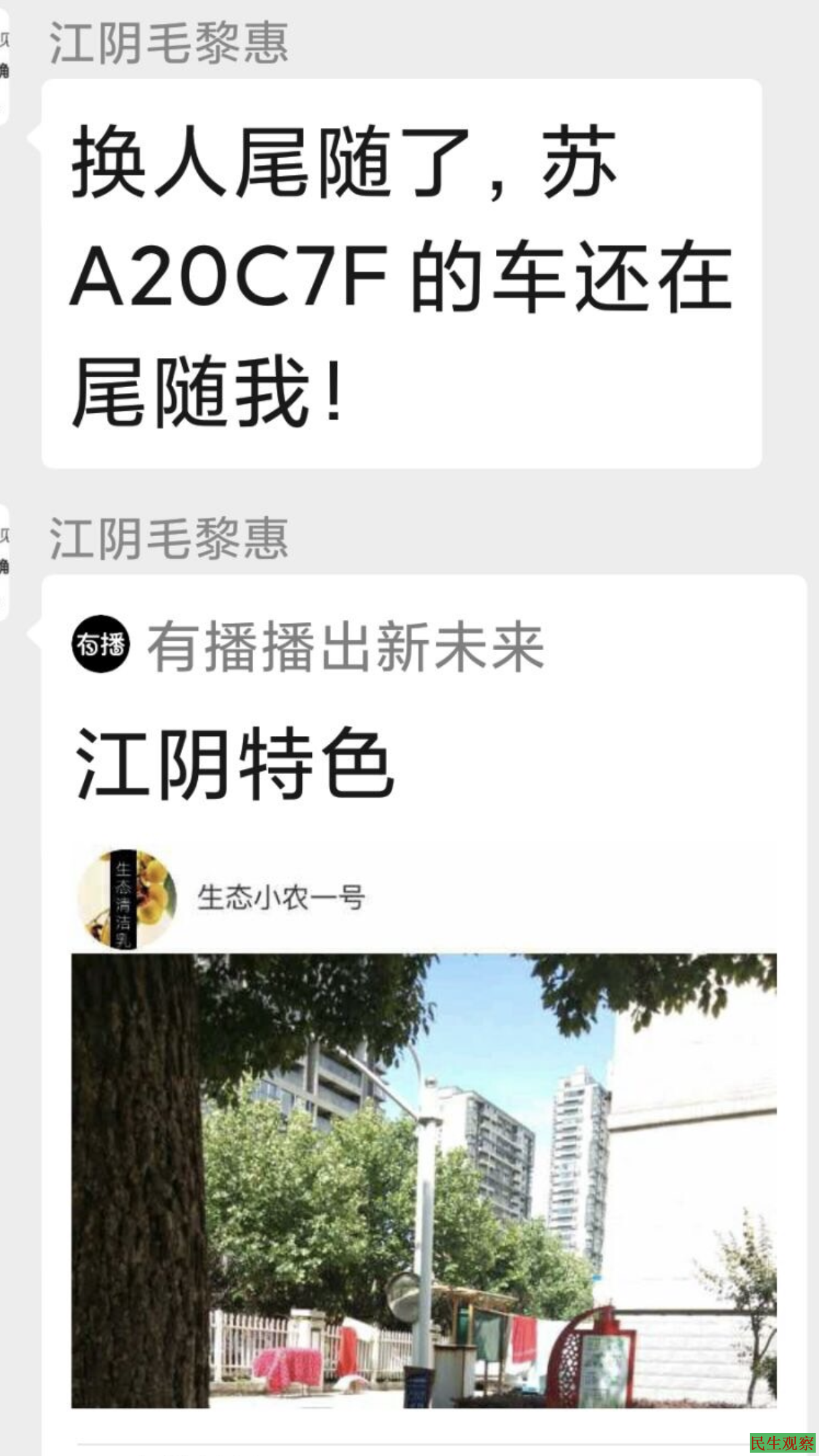 【民生观察2020年5月21日消息】本网获悉,中国全国政协十三届三次会议今天在京开幕,中共维稳机构仍在不择手段的打压维权人士,今天下午,江苏省江阴市维权人毛黎惠女士反映,今天上午自己出门购物时被辖区维稳人员跟踪监控。数日前,自己接到维稳警方通告,严禁在全国两会期间外出上访。