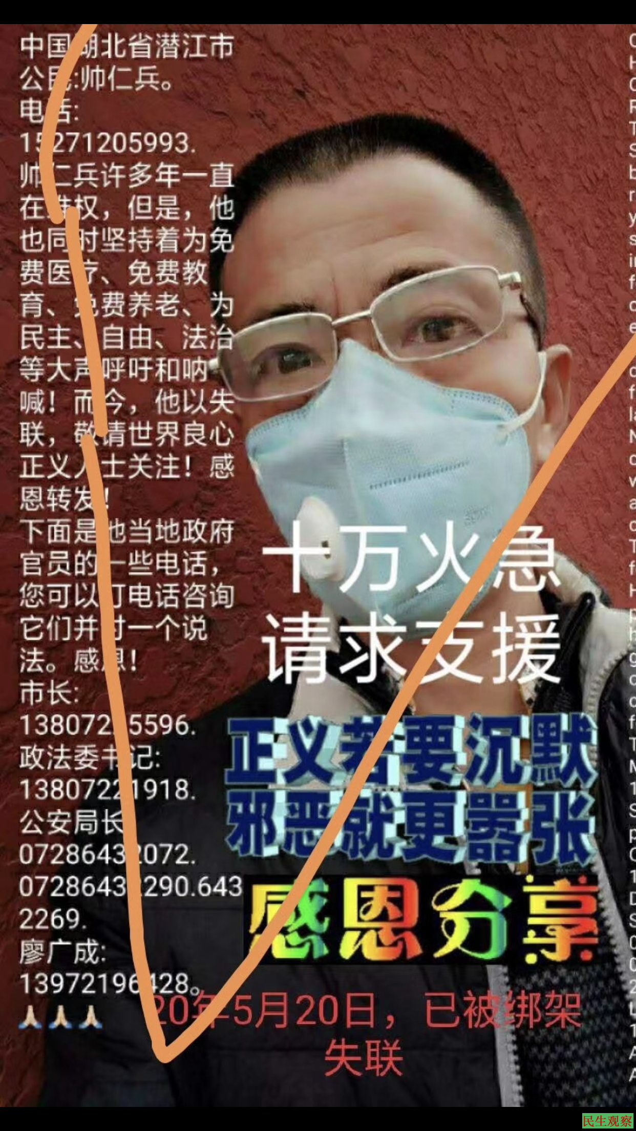 7、2020年5月20日,湖北潜江公民帅仁兵被绑架失联。帅仁兵多年来一直在维权,同时也坚持为免费医疗、免费养老、免费教育、为民主、自由法治等大声呼吁和呐喊!帅仁兵电话:15271205993