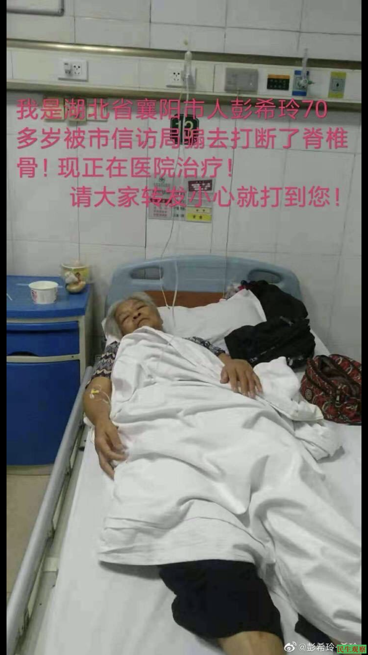 【民生观察2020年5月23日消息】湖北襄阳市72岁公民彭希玲,因为患重病儿子(曾是消防警察)争取权益而上访维权,长年遭当地维稳人员打押迫害。今年两会期间,彭希玲被维稳人员打伤并抢劫手机财物,家门被上岗看守,非法限制她的出行自由。