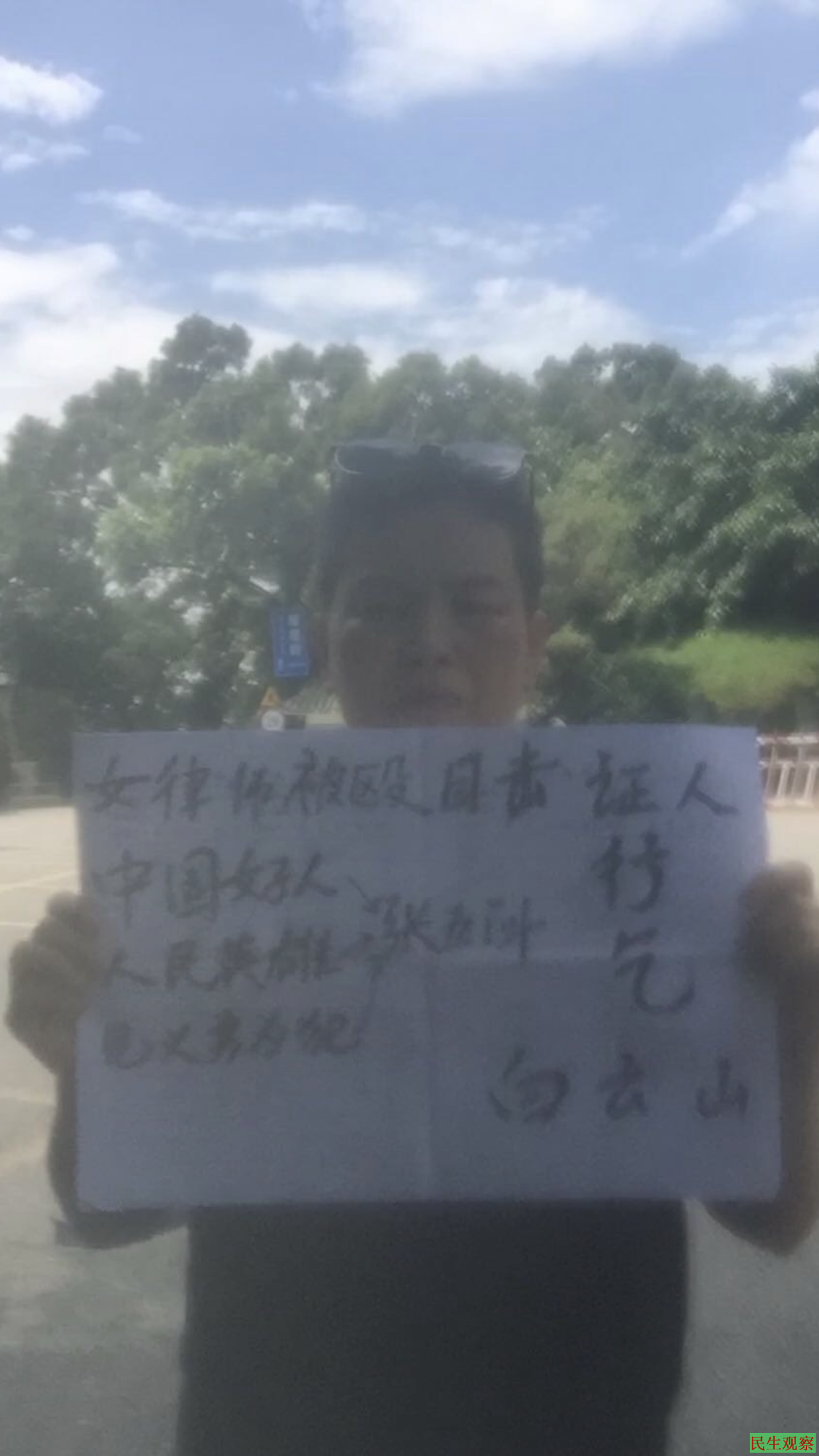 据了解,6月4日,张五洲在广州白云山风景区举牌,内容分别为“勿忘六世(四)、撤离恶法”以及“女律师被欧打、目击证人行乞”,拍摄照片及视频,并上传至多个微信群,以此纪念“六四”三十一周年及反对中共将在香港实施“国安法”。