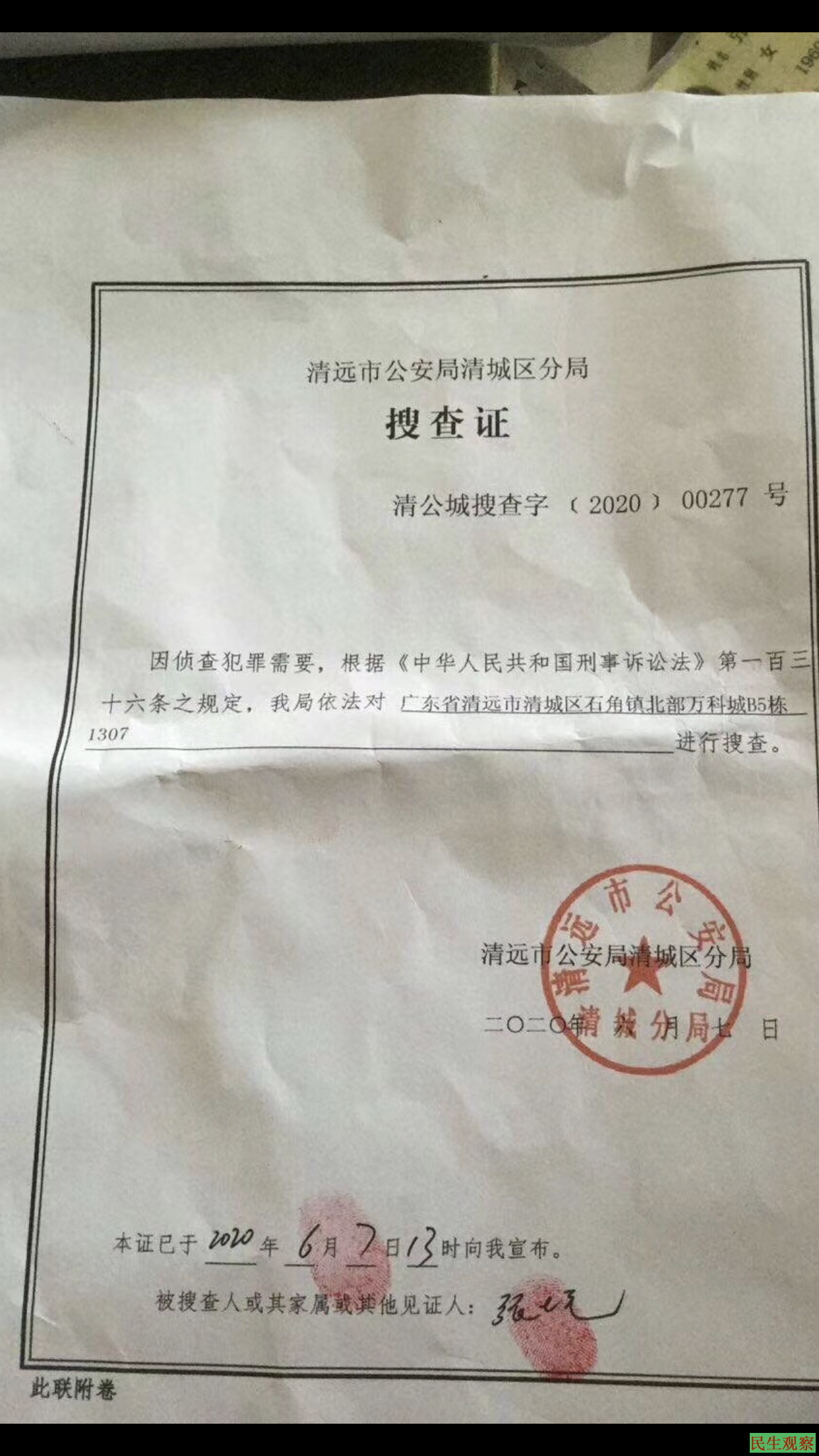 张五洲举牌后翌日,即6月5日下午两点左右,广东清远清城区石角派出所去到张五洲所住寓所,以涉嫌“扰乱公共秩序”为由对其进行传唤,关押一日后于6月6日转为刑事拘留,罪名更改为“寻衅滋事罪”,羁押于清城区看守所。警方并在6月7日上门搜查,当时正在寓所的张五洲妹妹张唯楚(张七毛)被按警方要求在《搜查笔录》上签字。根据警方在《搜查笔录》上的记录,经侦查人员仔细搜查并未在张五洲的寓所发现“举牌”案的相关证据。