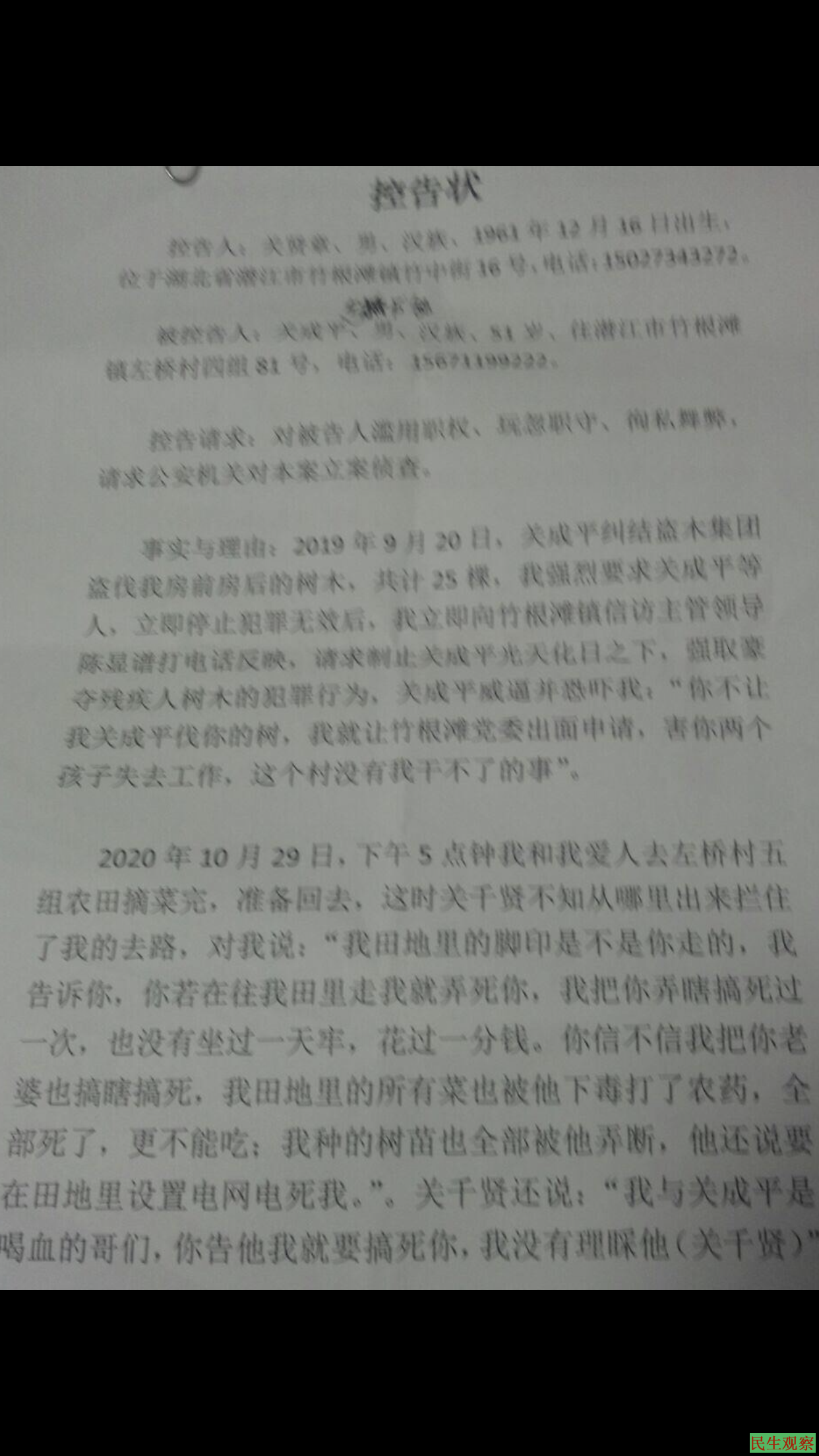 2019年9月20日,关成平勾结盗木集团盗伐关贤章房前屋后的树木,共计25棵,关贤章强烈要求关成平等人,立即停止犯罪无效后,关贤章立即向竹根滩镇信访主管领导陈显谱打电话反映情况,请求制止关成平在光天化日之下,强取豪夺残疾人关贤章家园树木,在众目睽睽之下违法犯罪抢夺,关成平威逼并恐吓关贤章,你关贤章不让我关成平伐你的树,我关成平让竹根滩党委出面申请,害你两个孩子失去工作,这个村没有我干不了的事。