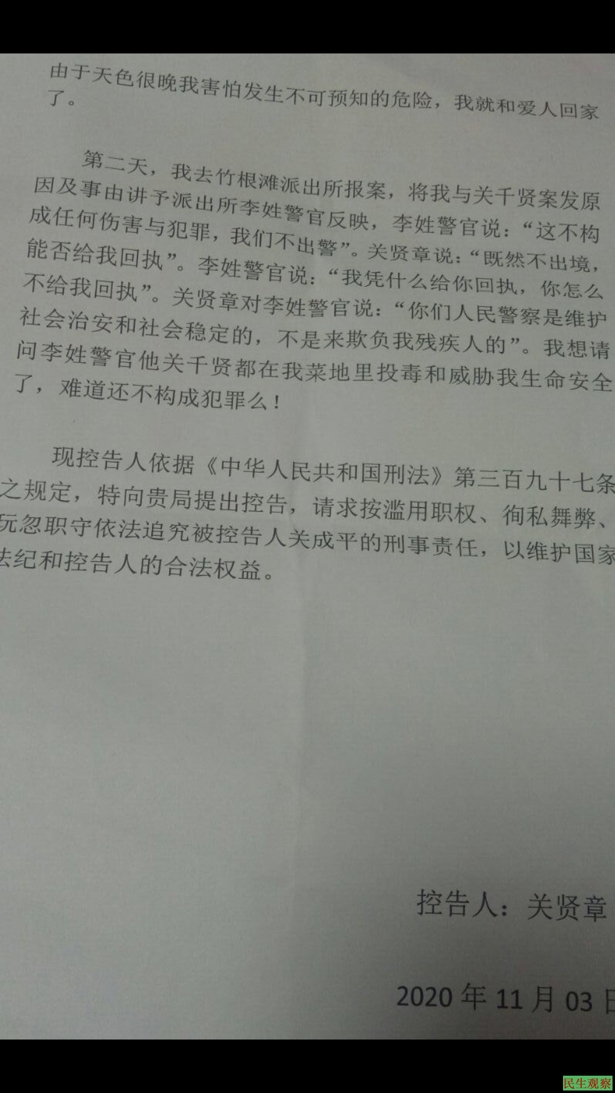 第二天关先章去竹根滩派出所报案,将自己与关千成案发原因及事由反映派出所李姓警官,李姓警官说;这不构成任何伤害与犯罪,我们不出警,关先章说;既然不出警能给我一份回执单?李警官说;我凭什么给你回执单?李警官甚至还说;关先章怎么不给他一份回执单?关先章对李警官说;你们是人民警察是维护社会治安和社会稳定的,不是来欺负我关先章盲人的,关先章还问李警官,关千成都在我菜地里投毒和威胁我关先章的生命安全了,我报案你们难道不出警吗?即使不构成犯罪,也是涉嫌犯罪吧?