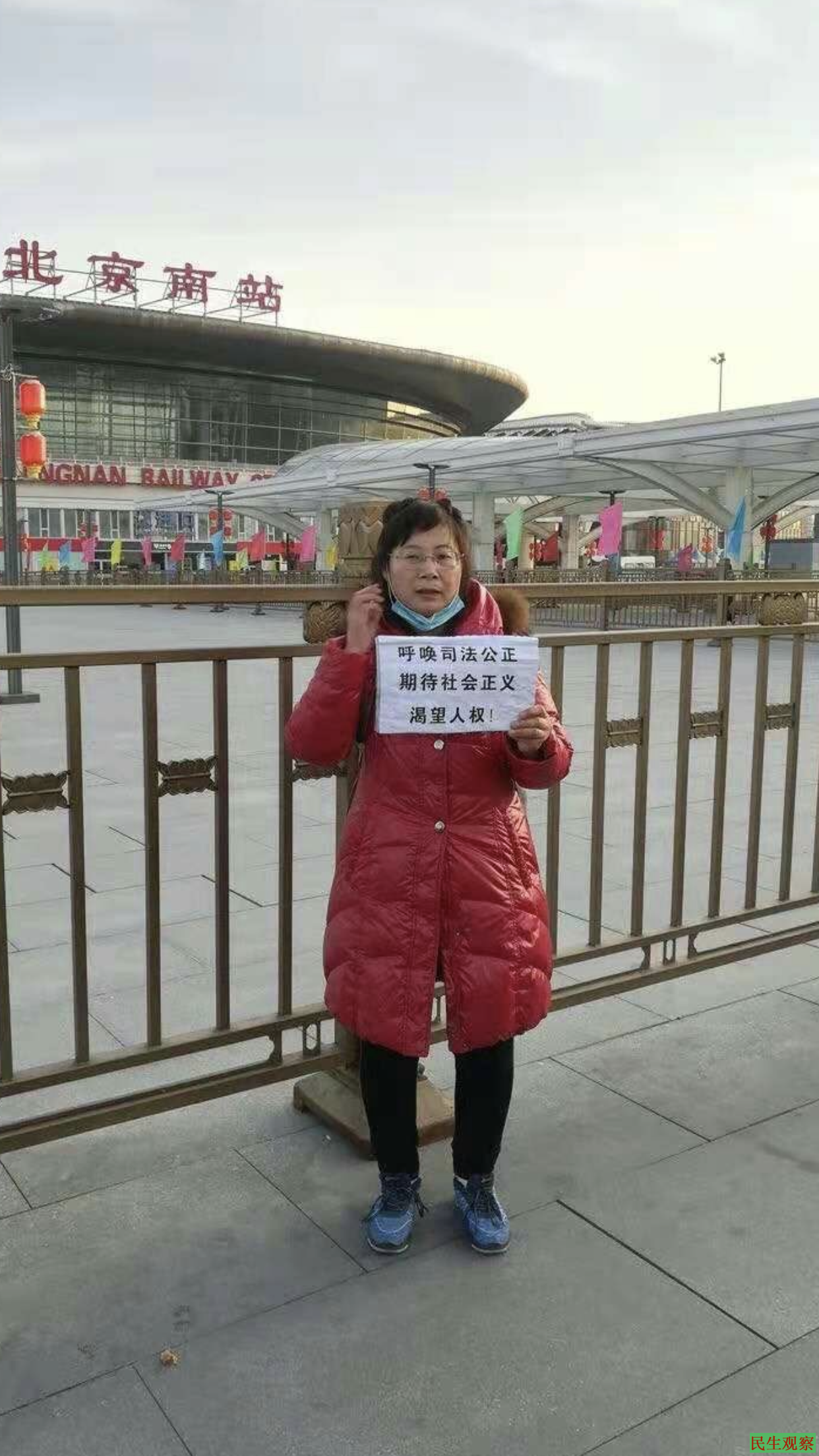 孙洪琴的母亲冤死在北京,到2021年1月2日已经是五周年祭日,孙洪琴母亲死无葬身之地5周年的祭日!求告无门的孙洪琴、万文英来到北京南站再次举牌呼吁人权日要关注访民的生活环境与人权严重被侵犯的问题,这是宪法赋予权利,但是合法的举报、控告、申诉的行为都遭到牢狱之灾,今天她们再次用行动来捍卫自己的合法权益,中国的人权?法治?在哪里?