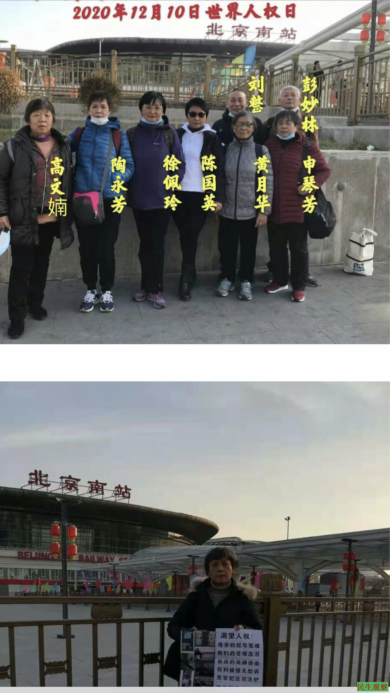 【民生观察2020年12月12日消息】2020年12月10日,世界人权日,上海重多维权人士在北京维权抗议她们多年被上海当局侵犯人权,她们都是多年维权的访民,长期奔波在上海与北京的维权路上,被当局打压迫害抓捕判刑关押黑监狱酷刑等等,这非法行为都是严重侵犯人权,今天在北京维权的上海访民有:高文婻,陶永芳,徐佩玲,陈国英,黄月华,申琴芳,彭妙林,刘憨,孙洪琴,万文英等访民。