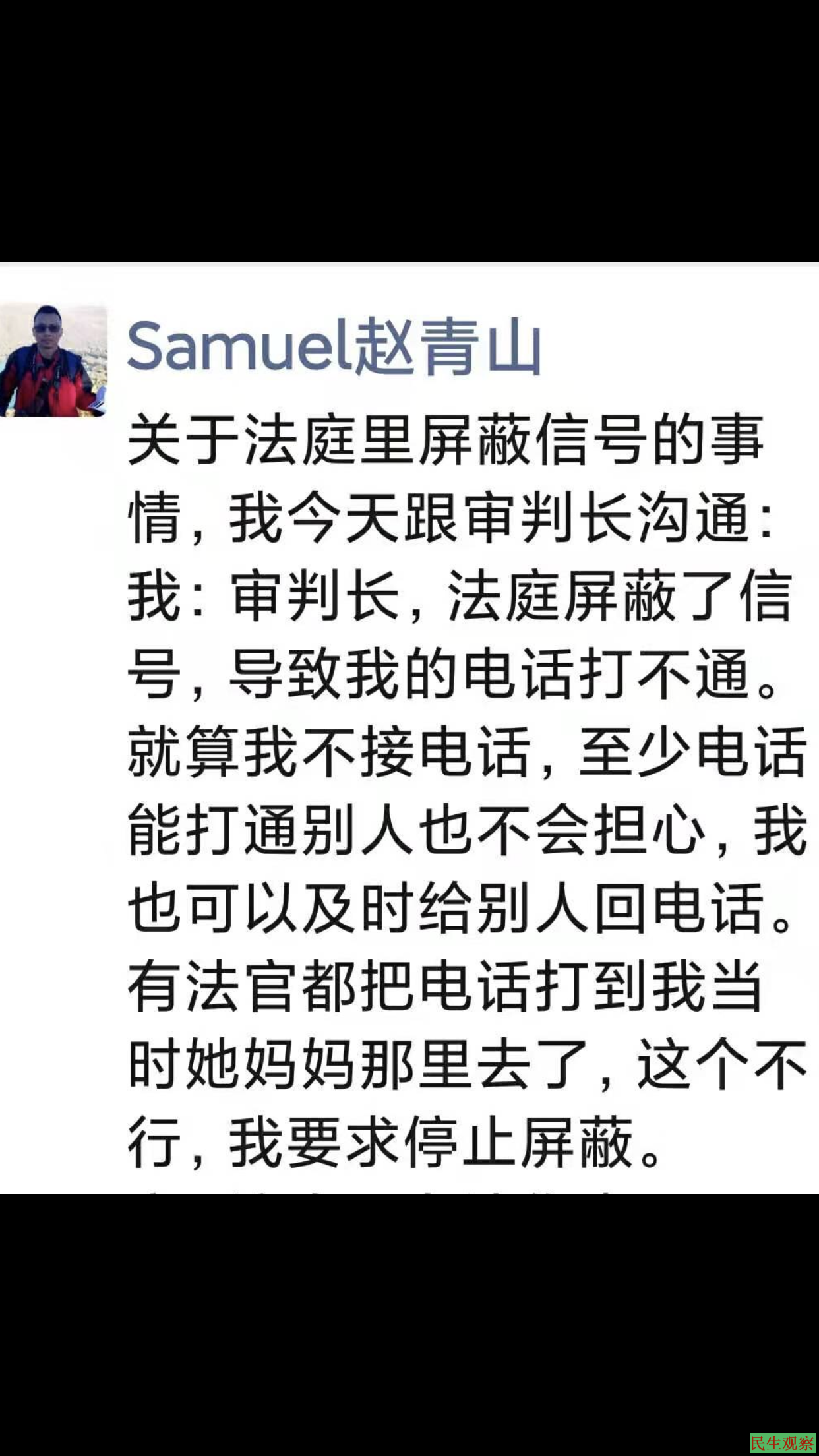 赵律师还向审判长反映说“审判长,法庭屏蔽了信号,导致我的电话打不通。就算我不接电话,至少电话能打通别人也不会担心,我也可以及时给别人回电话。有法官都把电话打到我当事人妈妈那里去了,这个不行,我要求停止屏蔽。”
