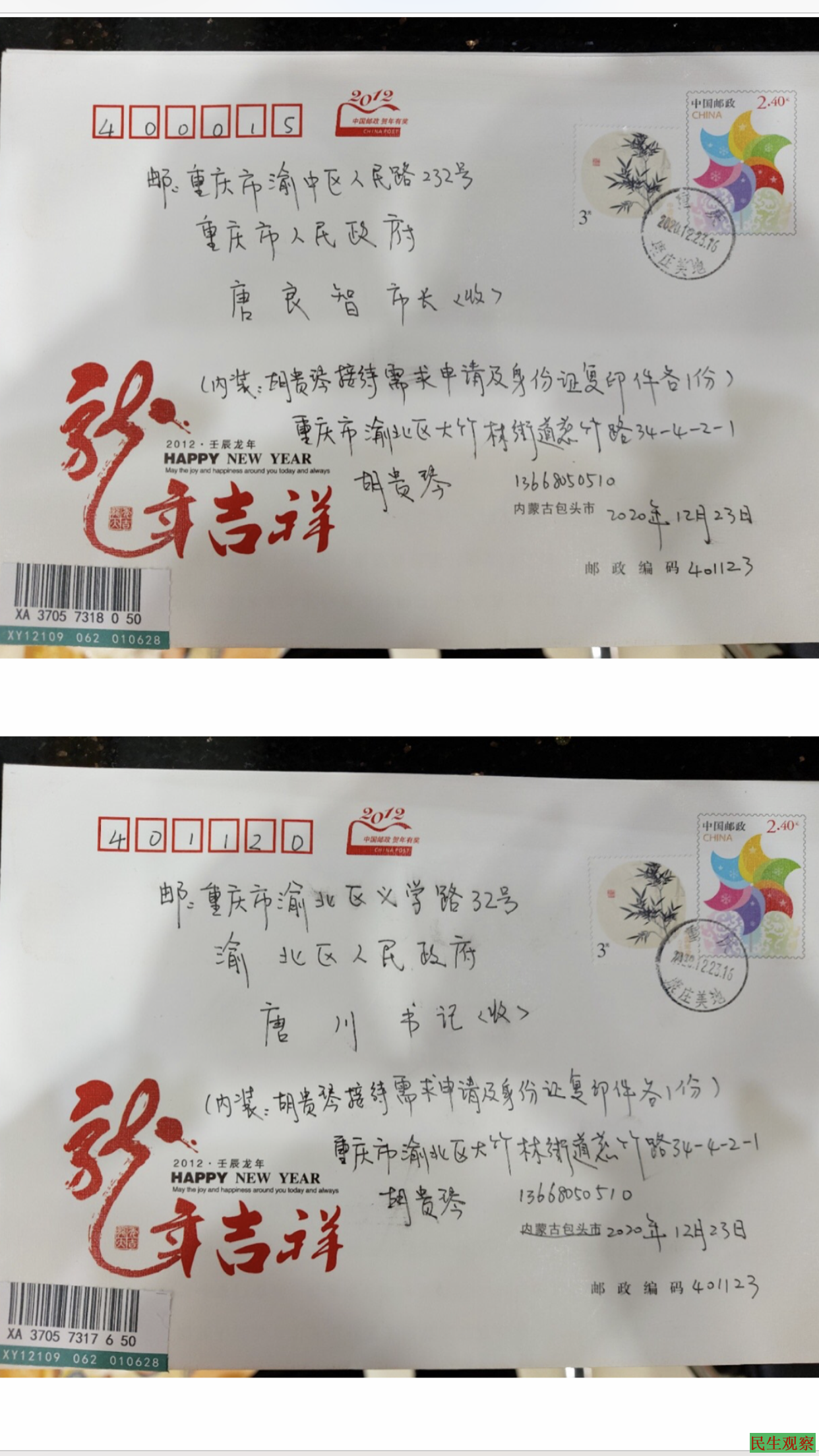 2月25日上午,双方在公园见面并有工作人员用手机偷拍会面照,并问胡贵琴的想法和困难。胡贵琴说:2020年11月和12月23日,她先后向渝北区区委书记唐川、重庆市市长唐良智、重庆市检察院检察长贺恒扬书面接待需求申请,并请求重庆市渝北区提供依法化解信访积案的平台。