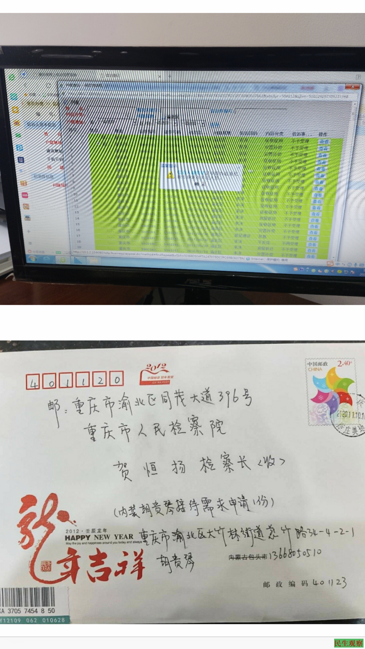 胡贵琴表示,她书面申请重庆市长唐良智、重庆市检察长贺恨扬、渝北区区委书记唐川等大领导接访,并要求提供依法化解信访积案的平台而遭打击报复,地方政府以她两会期间去北京看病,被重庆当局构陷入狱(今年2月8日,她在重庆市群众来访接待中心电脑上发现标注有:信访人胡贵琴重点关注人员,旁边标注有:重判),只能无语。)目前《宪法》、《民法典》都不能保护她家的居住权和生存权。维权道路崎岖,继续依法维权,她不愿当睁眼瞎。