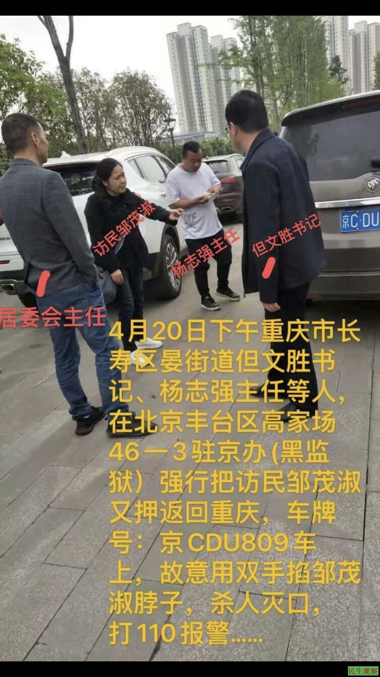 【民生观察2021年4月23日消息】4月19日,重庆维权人士邹茂淑、付淑清路过北京天安门、警察查身份证送北京久敬庄,再押北京丰台区高家场46-3驻京办(黑监狱)4月20日下午重庆市长寿区晏街道政法委杨普顺书记,打击报复访民,滥用职权,指使但文胜书记、杨志强主任等人,强行把访民邹茂淑押返回重庆,车牌号:京CDU809车上,团伙工作人员故意用双手掐访民邹茂淑脖子,要杀人灭口,付淑清坐车牌号:京AXC428车上,4月21日到重庆市长寿区晏家派出所报警,警察故意把团伙黑恶凶手放跑了。