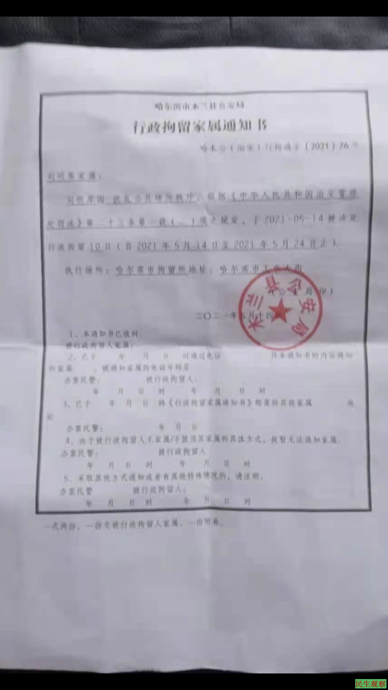 【民生观察2021年5月15日消息】黑龙江省哈尔滨市木兰县建国乡访民刘明库,因土地81亩被前任村书记李丙吉占用,国家每年给的补贴款钱也被前任村书记妻子领取而上访。2021年5月14日,刘明库因进京上访被带回户籍地,随即被木兰县公安局行政拘留10天。